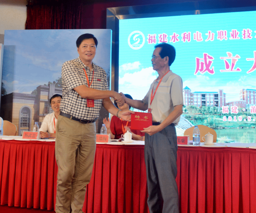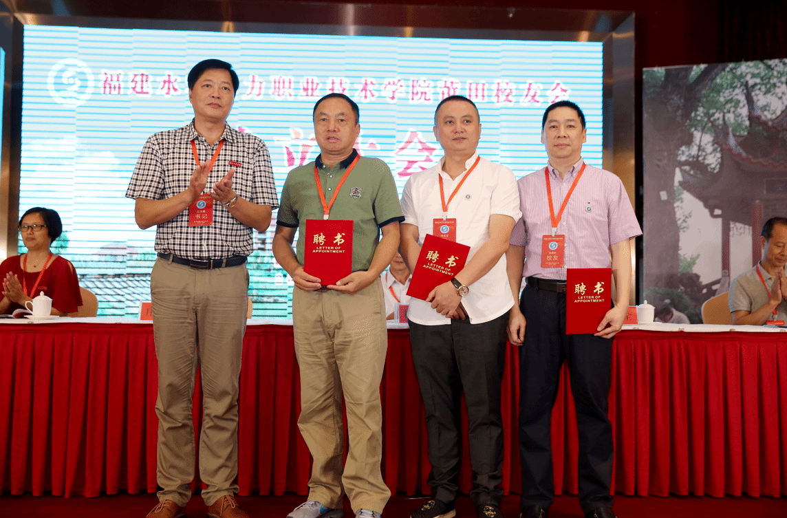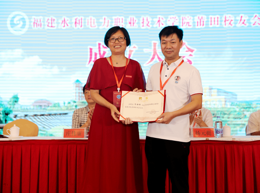 在全场校友热烈的掌声中,庄伟廉向莆田校友会授牌,黄瑞梅为莆田校友会第一届理事会负责人颁发聘书。莆田校友会成立不仅标志着我院在发源地开创了校友工作的新篇章,也意味着水院的寻根溯源之旅开启了新的阶段,从1929年创办到1956年搬迁至永安这一阶段的前辈校友也在自己家乡有了感情联络,交流情谊的崭新平台。