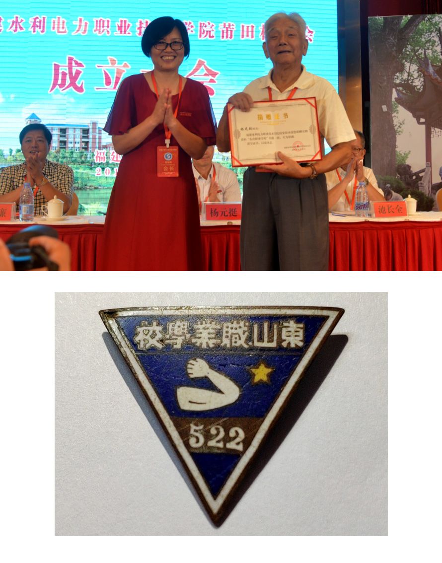 接着,80级继保班莆田校友林元豹向母校捐赠了父辈珍藏的上世纪三十年代“莆田县私立东山职业学校”时期校徽一枚,委托49级校友陈文护参加捐赠仪式,黄瑞梅代表校友总会接受捐赠并颁发了捐赠证书。