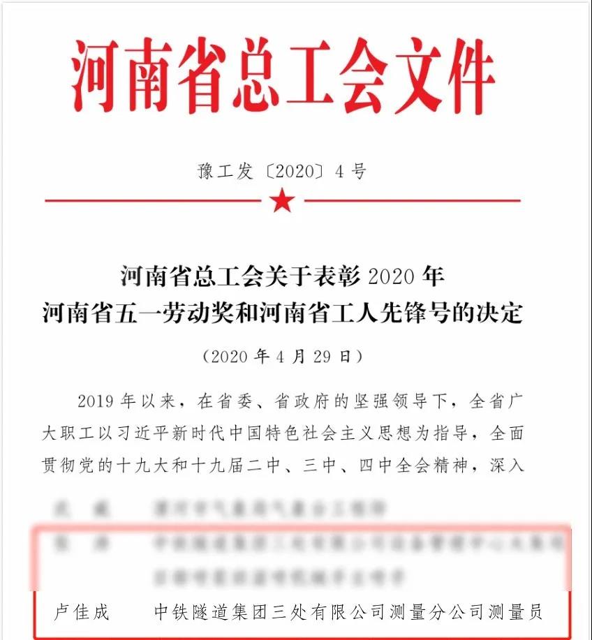 近日,2020年河南省五一劳动奖状、奖章和工人先锋号评选结果揭晓。我院水电1533班校友卢佳成荣获河南省五一劳动奖章。