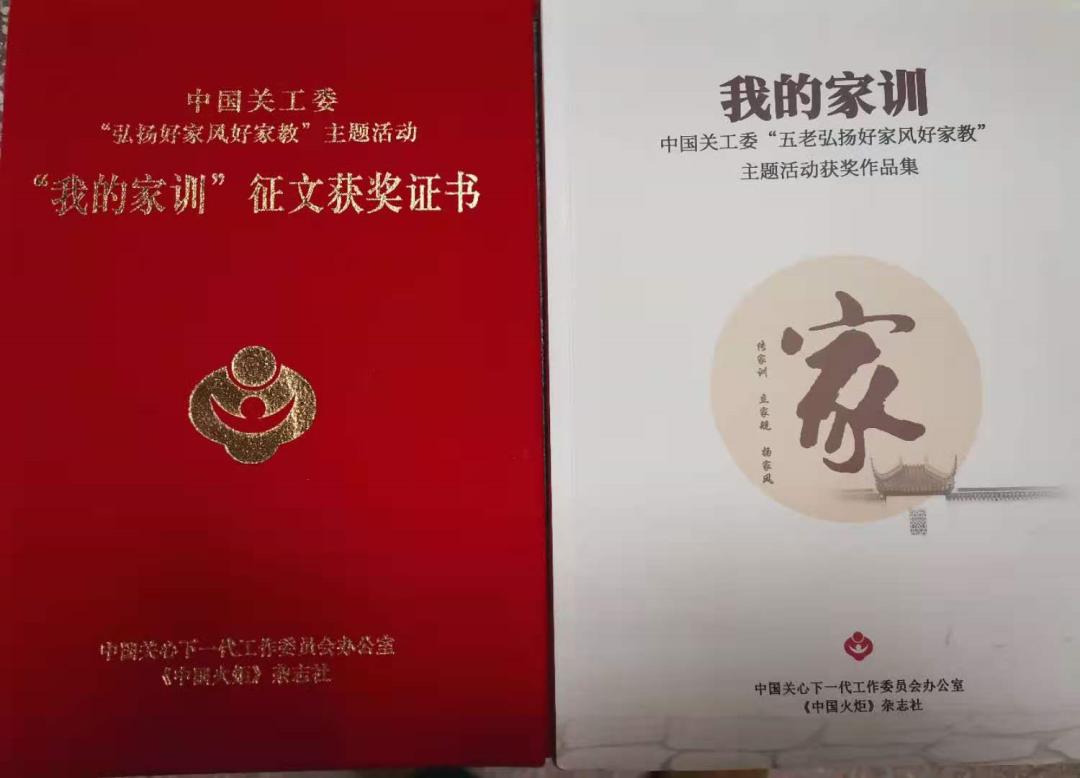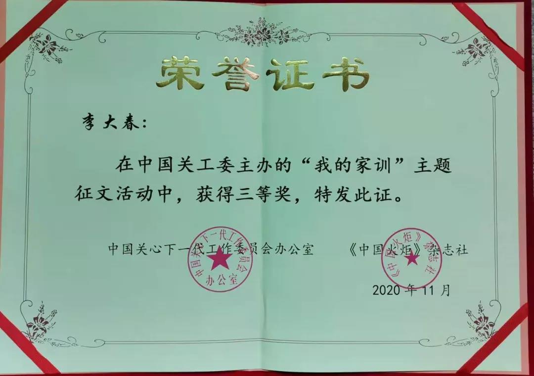 为了深入贯彻落实习近平总书记关于注重家庭、注重家教、注重家风的重要指示精神,李大春校友在中国关工委、《中国火炬》在全国开展“我的家训”主题征文活动中获得三等奖。此作品在福建省开展征文活动期间作品《善德传家》获得一等奖,并由福建省关工委选送至全国参赛,经由有关专家用近一年的时间初审复审及有关领导审定,在30个省市自治区及有关单位3000多篇征文作品中层层甄选,获得了三等奖。