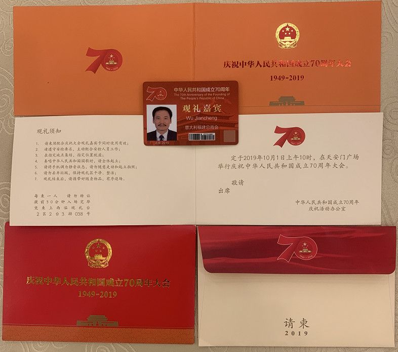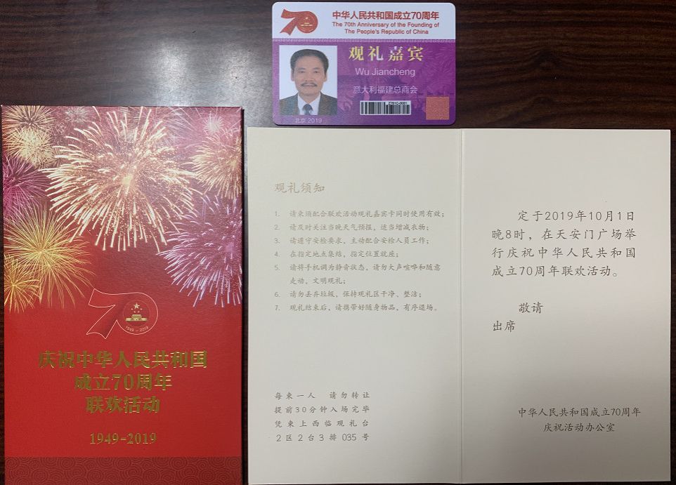 此外,9月28日下午,吴建成还作为海外侨胞代表,受邀在人民大会堂宴会厅参加庆祝中华人民共和国成立70周年招待会;9月29日上午,受邀在钓鱼台国宾馆参加招待会。