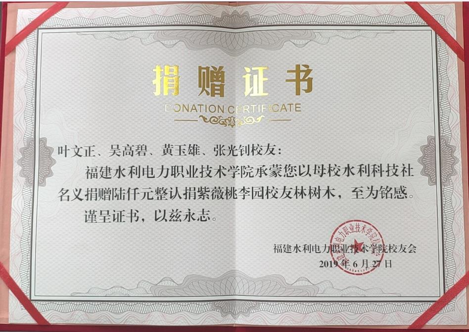628叶文正、吴高碧、黄玉雄、张光钊等四位校友返校参加我院承办的2019年全省“水利安全生产监管系统”培训班之际,以母校水利科技社名义向母校捐赠6000认捐紫薇桃李园校友林树木,借以表达对母校的深厚情谊。