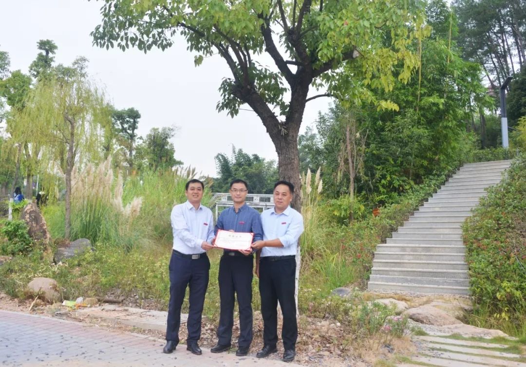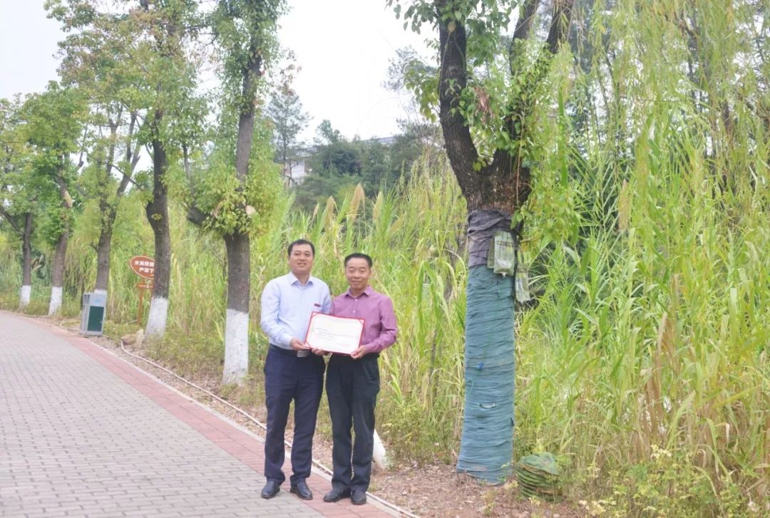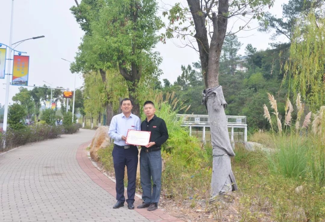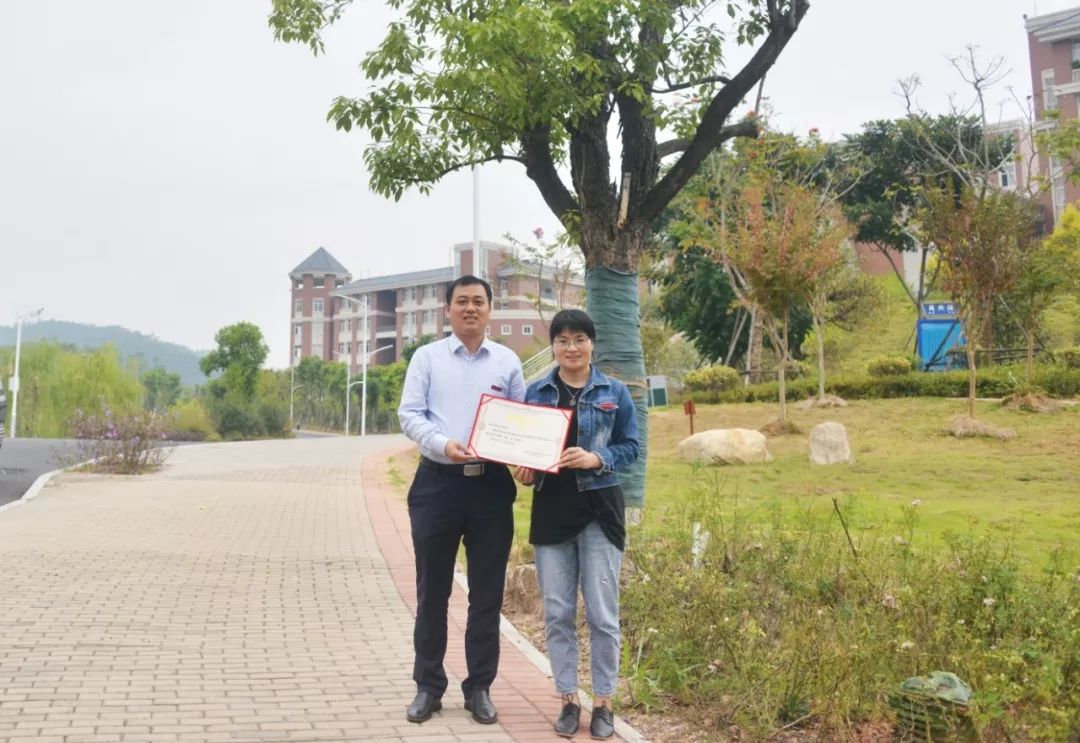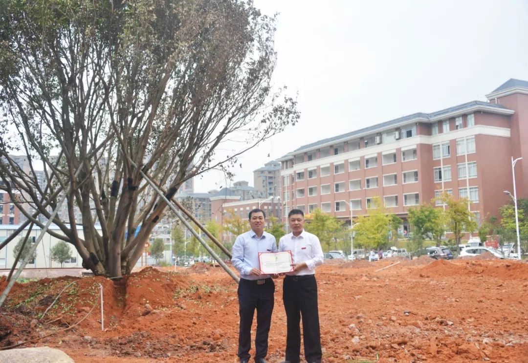 水电9942班校友认捐学院东大门东山路旁香樟树一棵,班主任卓美燕代表班级进行捐赠,学院副院长杨武盖为校友颁发捐赠证书。