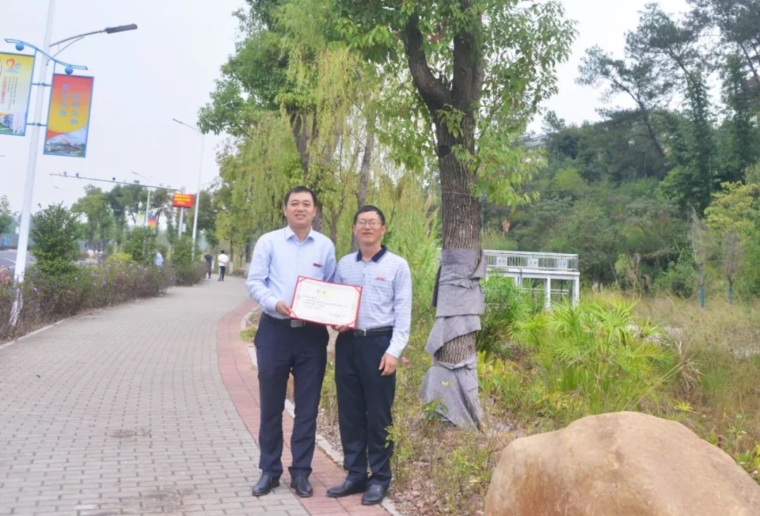 电力9242班校友认捐学院东大门东山路旁香樟树一棵,班主任刘德旺代表班级进行捐赠,学院副院长杨武盖为校友颁发捐赠证书。