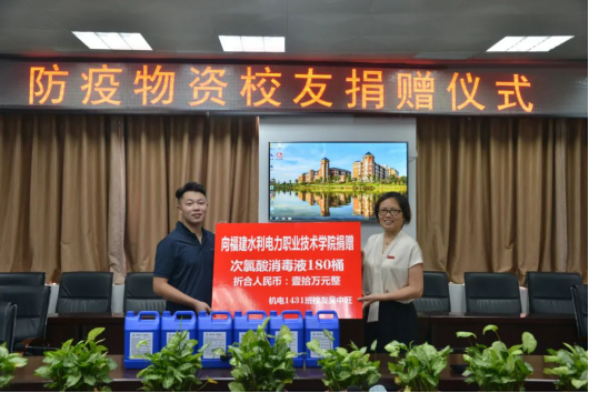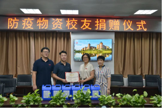 9月10日上午,机电1431班校友吴中旺向母校捐赠次氯酸消毒液180桶,折合人民币十万元整,以实际行动助力母校常态化疫情防控工作。