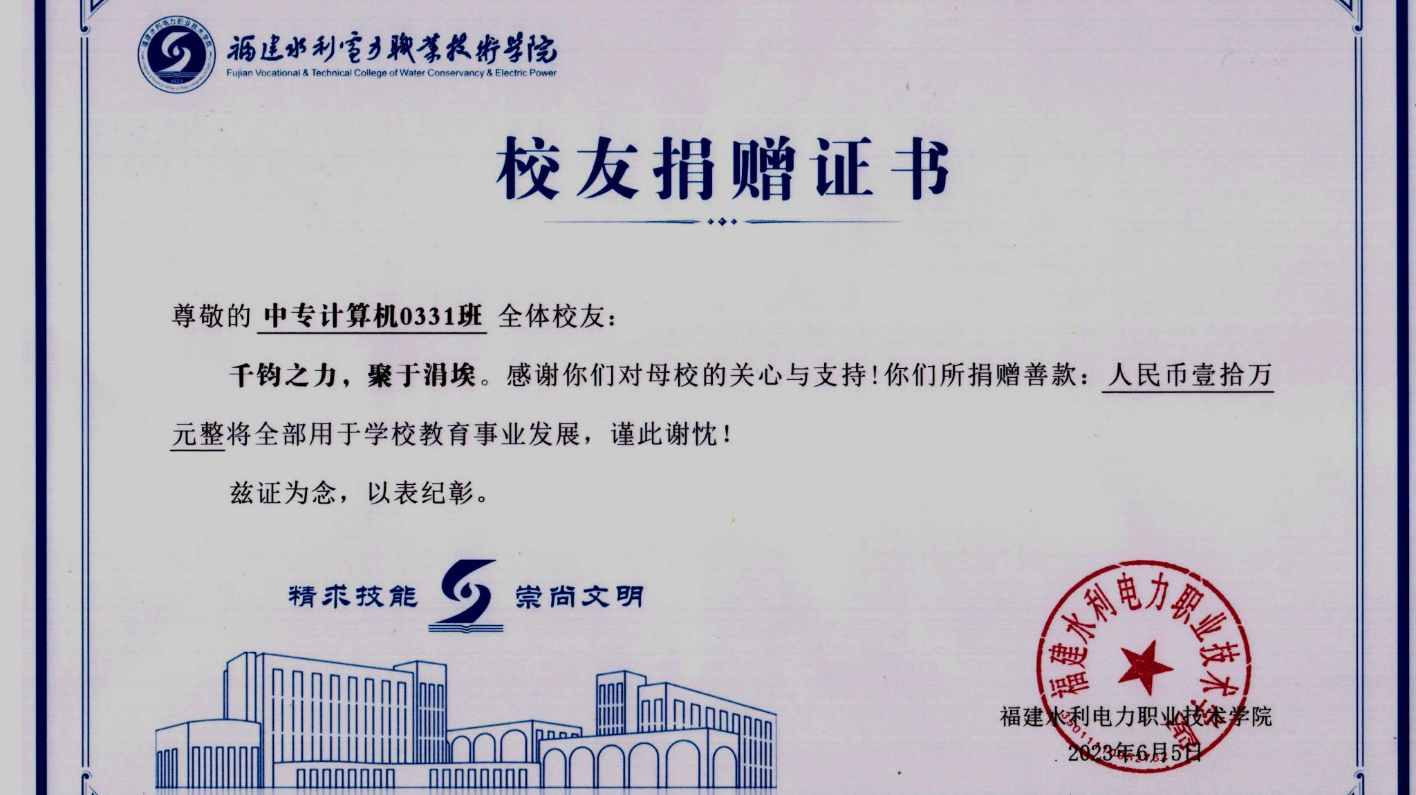 中专计算机0331班共有48名学生,于2003年入校学习,2006年毕业,毕业后班级同学散布在全国各地,其中不乏行业翘楚和企业精英。树高千尺不忘根,水流万里总思源。校友们希望通过自己的力量,为母校的发展建设贡献一份力量,同时也希望影响和感染更多的学子以“精求技能、崇尚文明”的校训精神为指引,潜心钻研、努力拼搏、勤学苦练,用技能成就自我、以奋斗点亮青春。