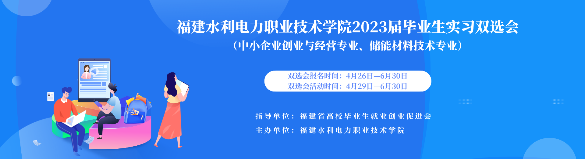 为深入贯彻落实党中央、国务院关于高校毕业生就业工作的决策部署,进一步加强用人单位和求职毕业生的双向沟通和选择,实现人才资源的合理流动,促进全省普通高校毕业生更高质量就业,我校联合福建省高校毕业生就业创业促进会共同举办2023届毕业生实习双选会,诚邀各用人单位加入。