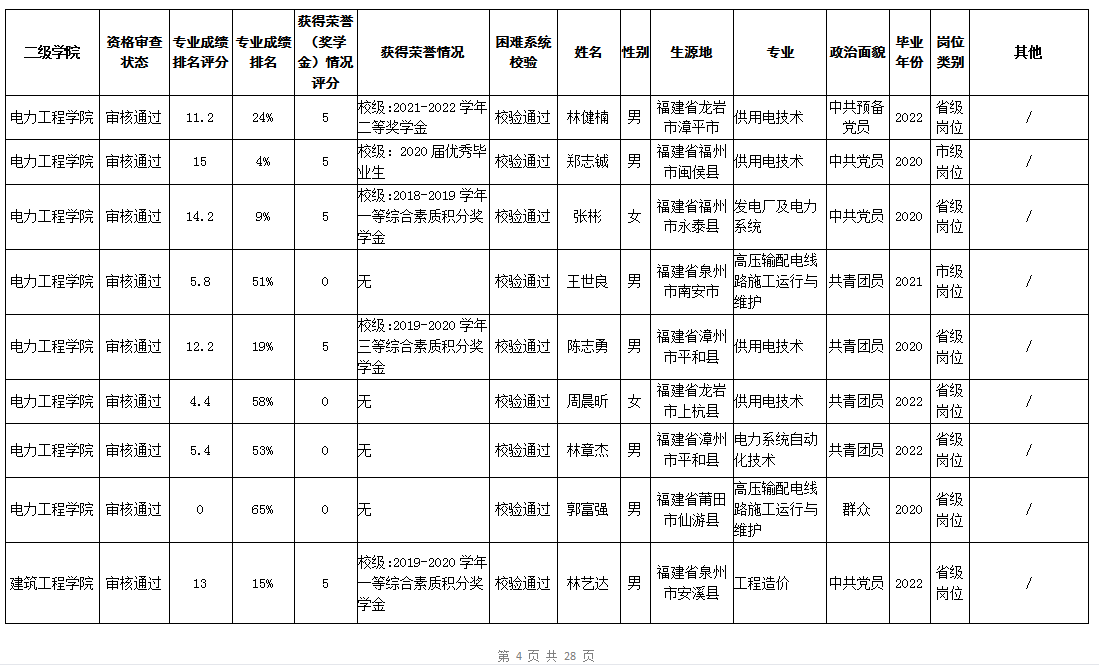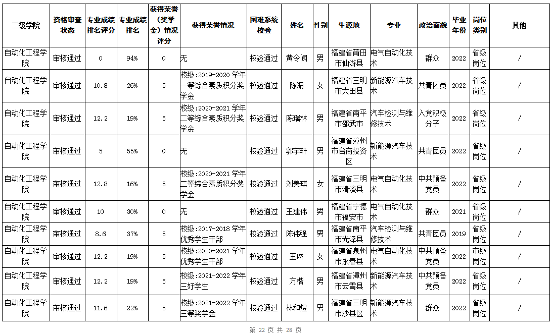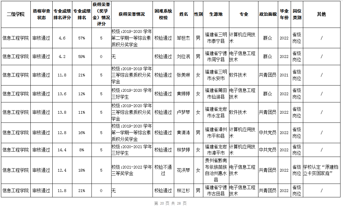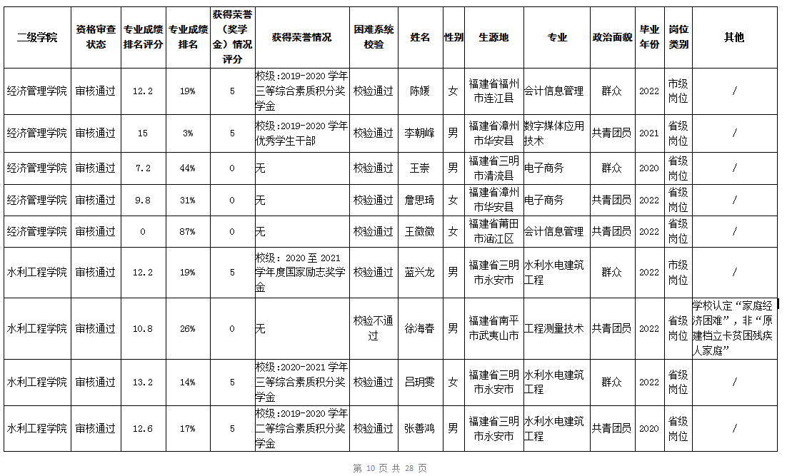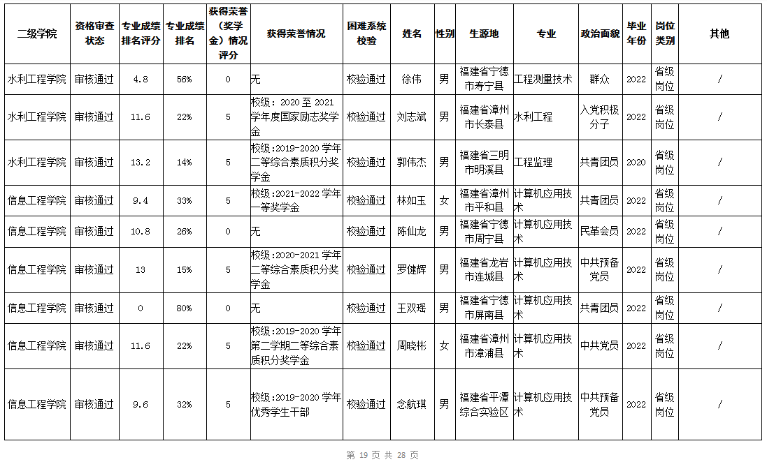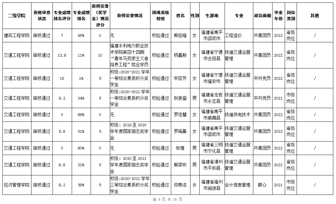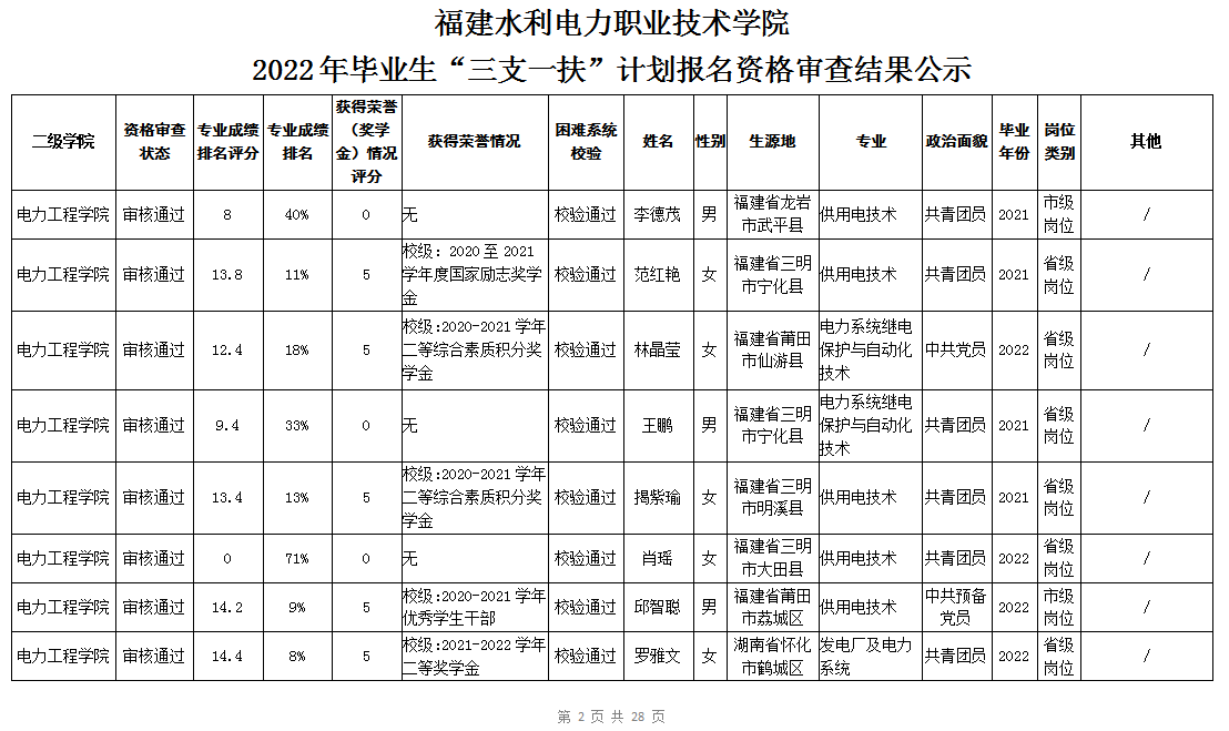 根据《福建省2022年高校毕业生“三支一扶”计划实施方案》(闽毕办〔2022〕6号)、《福建省2021年“三支一扶”计划省内高校毕业生审核办法》《福建省2022年“三支一扶”计划招募公告》要求,学院坚持公开公正的原则开展毕业生报名审查考核工作。经学生本人申请、二级学院初审、招生就业处复核,现将我院应、往届毕业生2022年“三支一扶”计划报名资格审查结果进行公示。