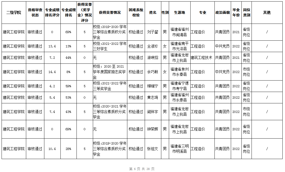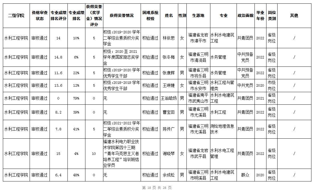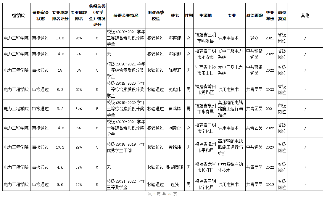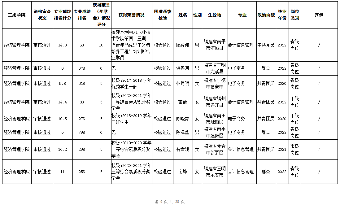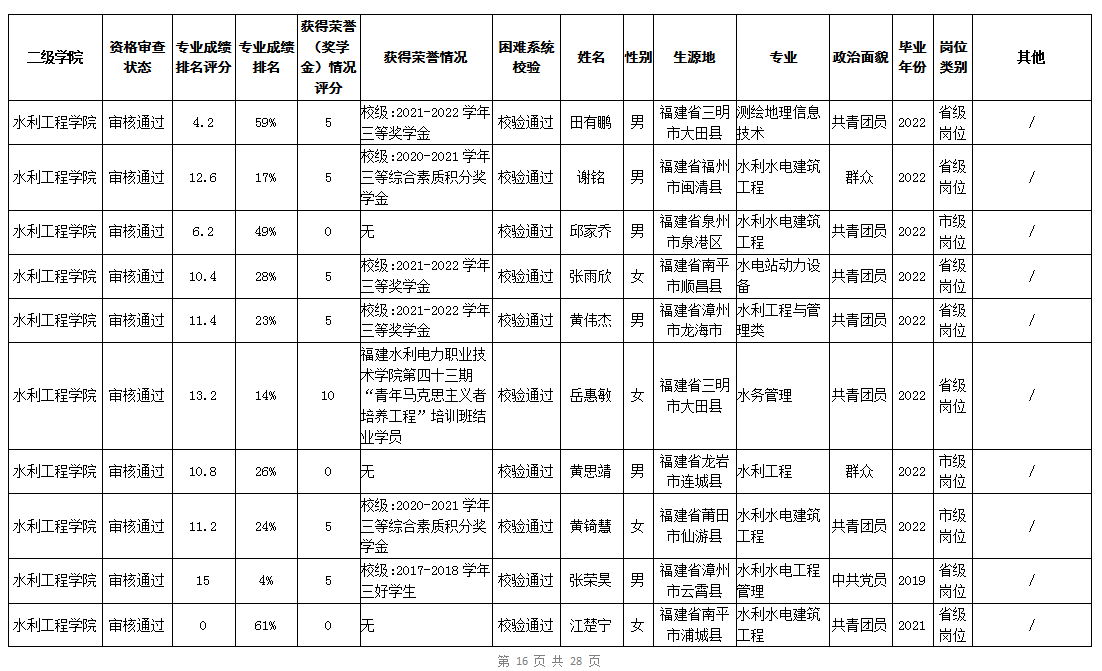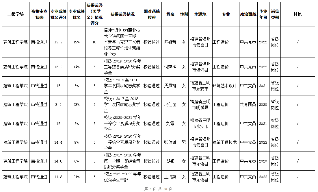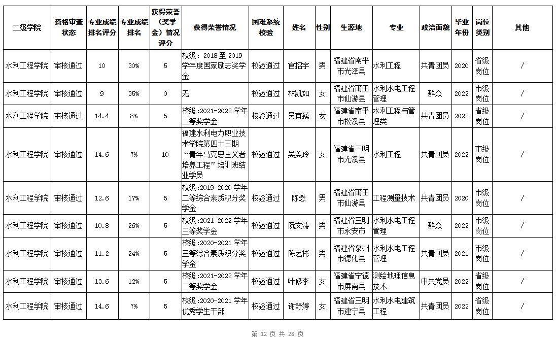 根据《福建省2022年高校毕业生“三支一扶”计划实施方案》(闽毕办〔2022〕6号)、《福建省2021年“三支一扶”计划省内高校毕业生审核办法》《福建省2022年“三支一扶”计划招募公告》要求,学院坚持公开公正的原则开展毕业生报名审查考核工作。经学生本人申请、二级学院初审、招生就业处复核,现将我院应、往届毕业生2022年“三支一扶”计划报名资格审查结果进行公示。