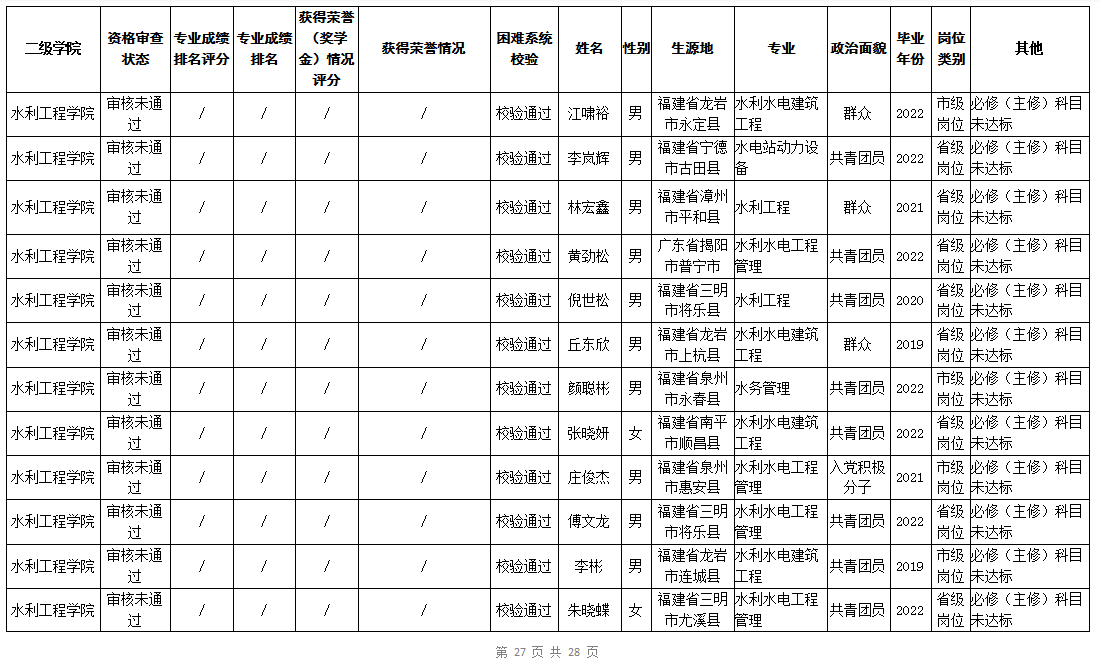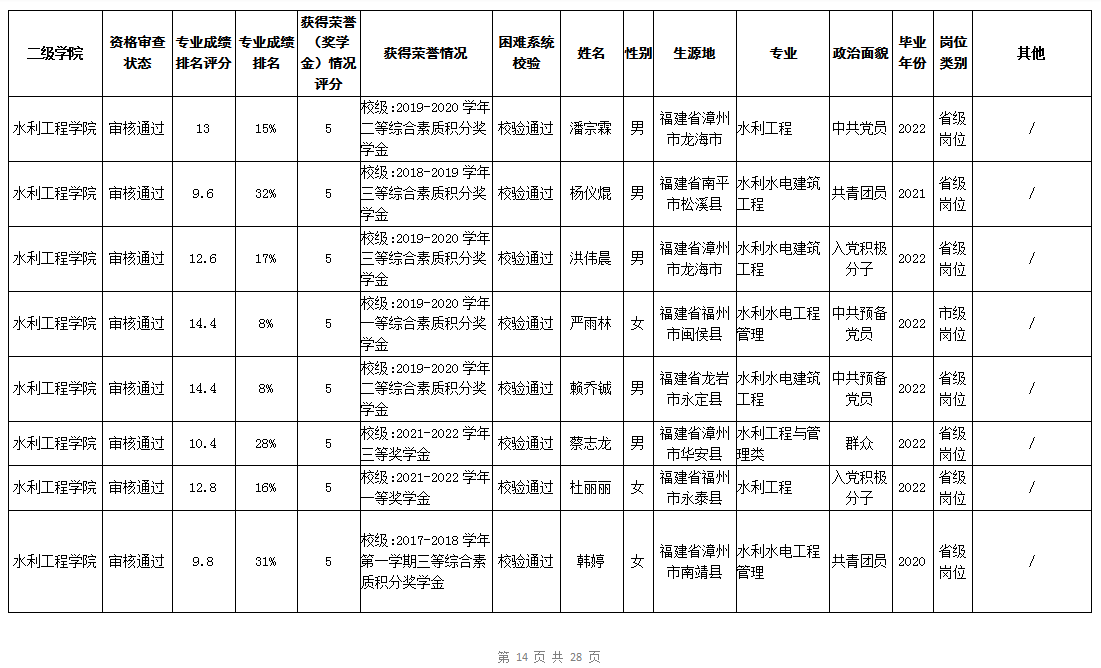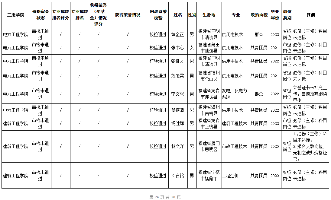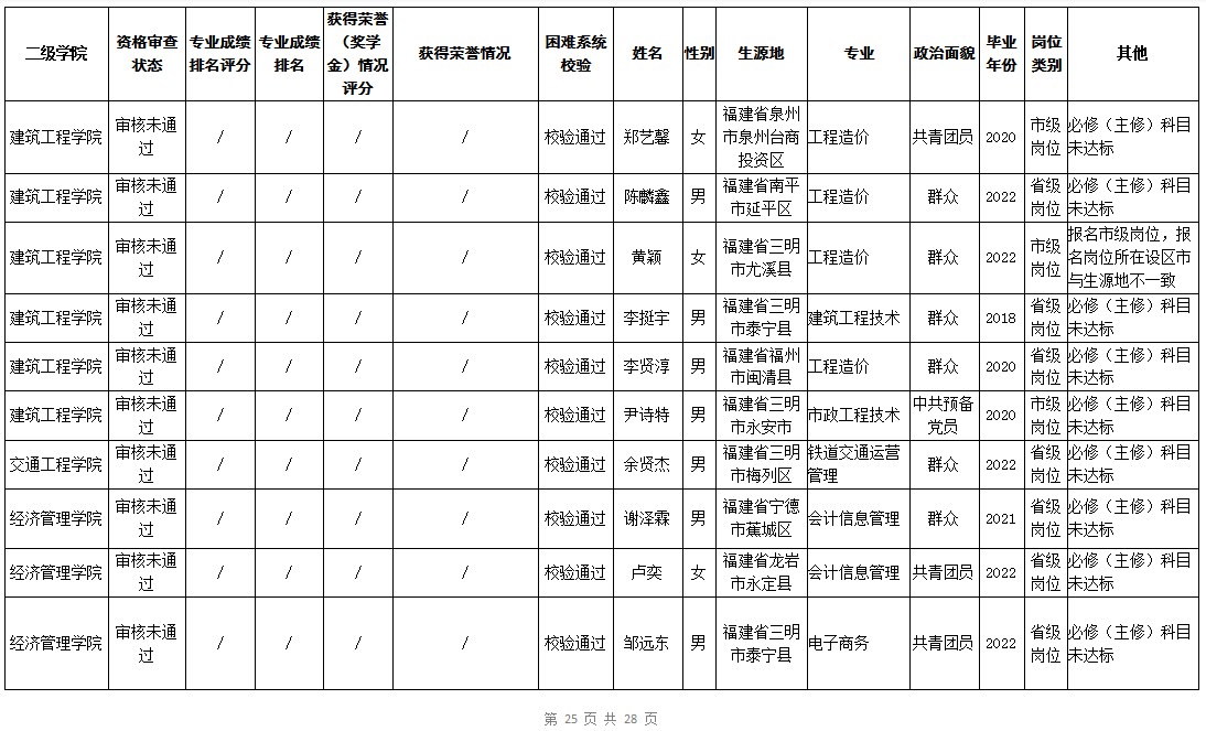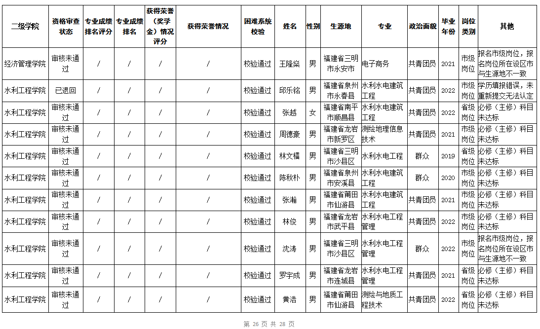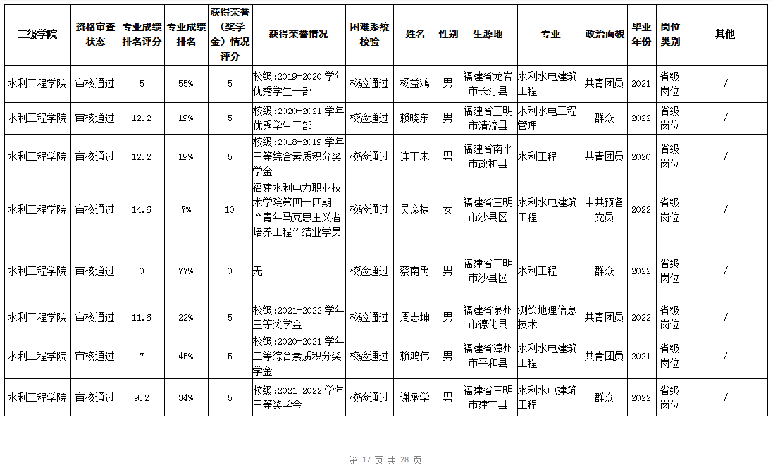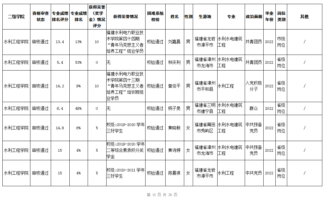 根据《福建省2022年高校毕业生“三支一扶”计划实施方案》(闽毕办〔2022〕6号)、《福建省2021年“三支一扶”计划省内高校毕业生审核办法》《福建省2022年“三支一扶”计划招募公告》要求,学院坚持公开公正的原则开展毕业生报名审查考核工作。经学生本人申请、二级学院初审、招生就业处复核,现将我院应、往届毕业生2022年“三支一扶”计划报名资格审查结果进行公示。