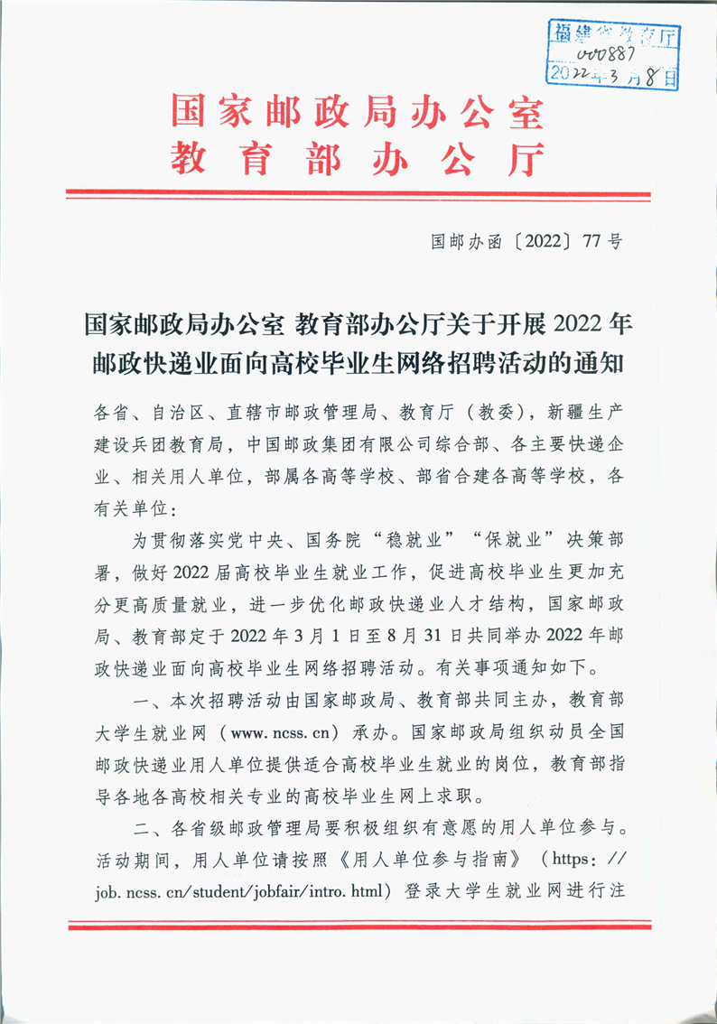 为进一步优化邮政快递业人才结构,国家邮政局办公室、教育部办公厅联合下发通知,共同举办2022年邮政快递业面向高校毕业生网络招聘活动。。