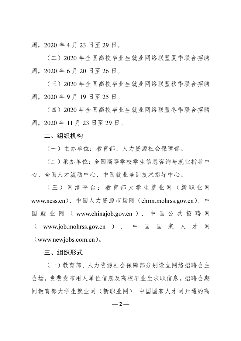 为深入贯彻习近平总书记关于统筹推进新冠肺炎疫情防控和经济社会发展的重要指示精神,进一步做好全国普通高等学校毕业生就业工作,教育部、人力资源社会保障部决定联合举办2020年全国高校毕业生就业网络联盟招聘。