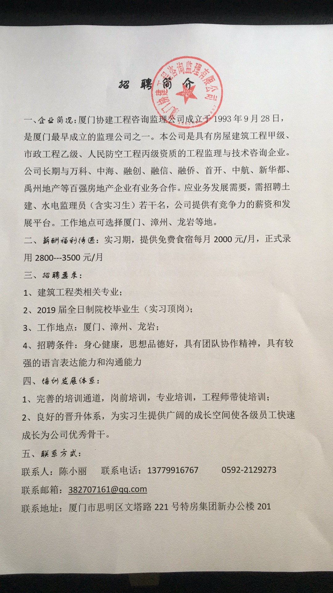 厦门协建工程咨询监理有限公司2019年招聘简章