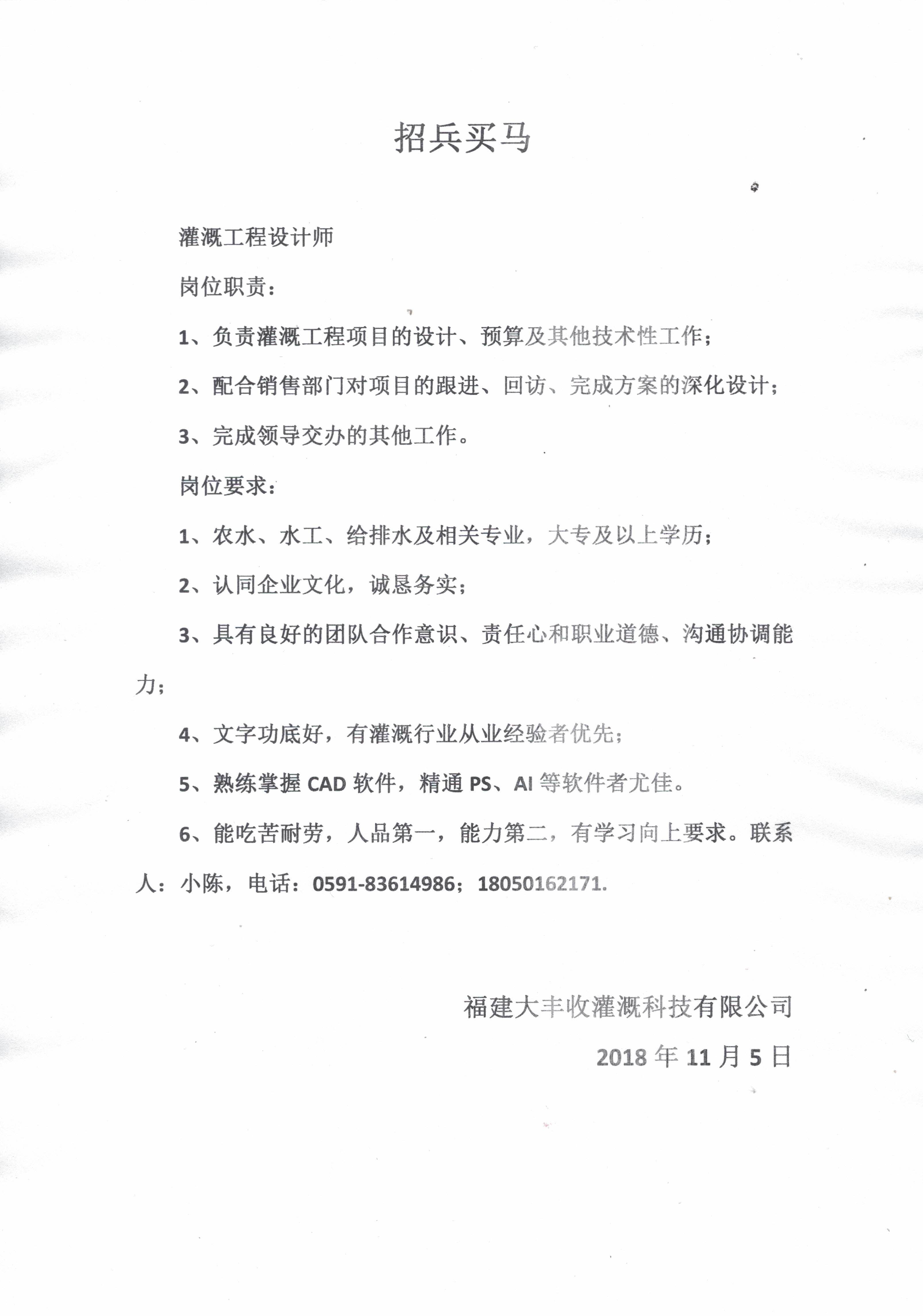 福建大丰收灌溉科技有限公司2019年招聘简章