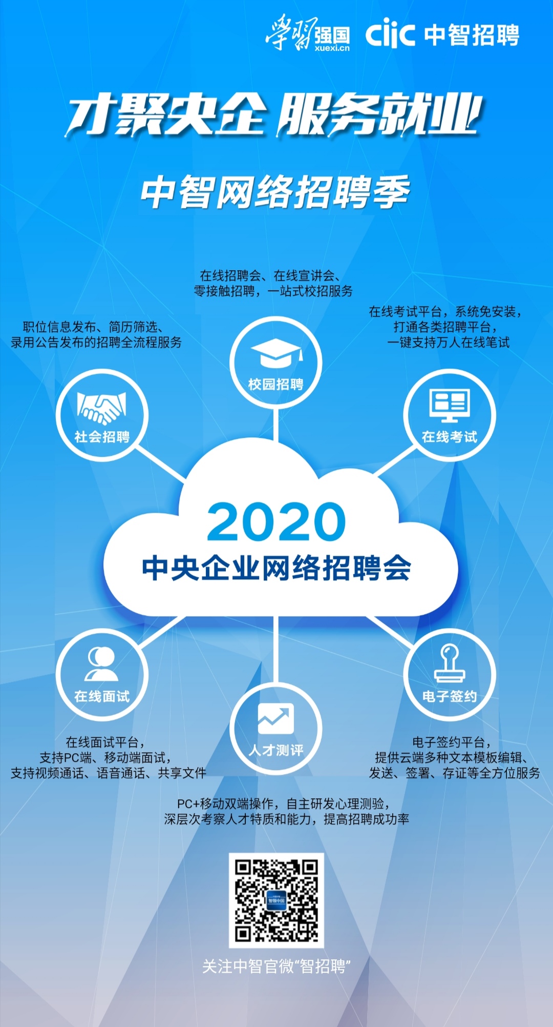2020年3月9日,“才聚央企,服务就业,中智网络招聘季”专项招聘活动将正式启动,即日起“学习强国”学习平台将在首页“推荐”频道同步招聘信息,如果你有求职需求,欢迎进入中央企业“云招聘”入口浏览。