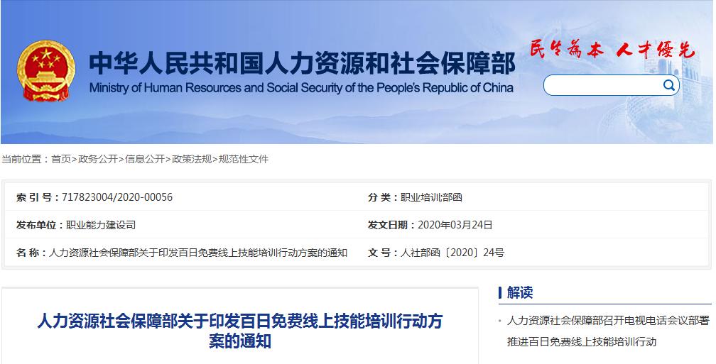 日前,人力资源社会保障部召开电视电话会议,贯彻落实《人力资源社会保障部关于印发百日免费线上技能培训行动方案的通知》(人社部函〔2020〕24号)要求,部署推进百日免费线上技能培训行动和职业能力建设重点工作。