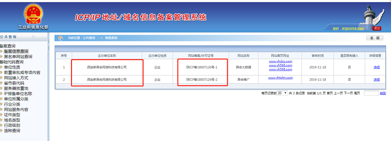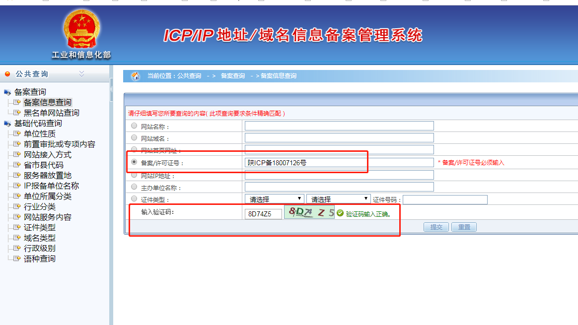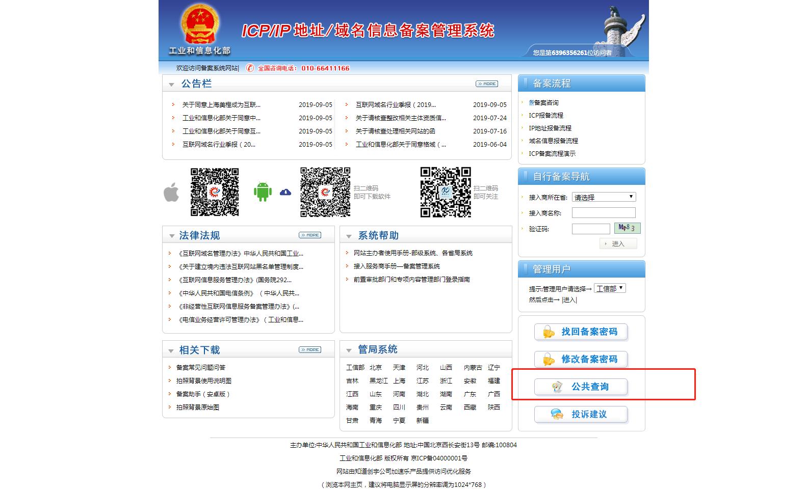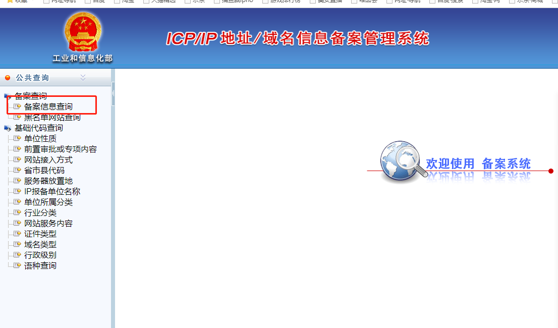 进入工业和信息化部ICP/IP 地域/域名信息备案管理系统,点击【公共查询】→【备案信息查询】:↓↓↓