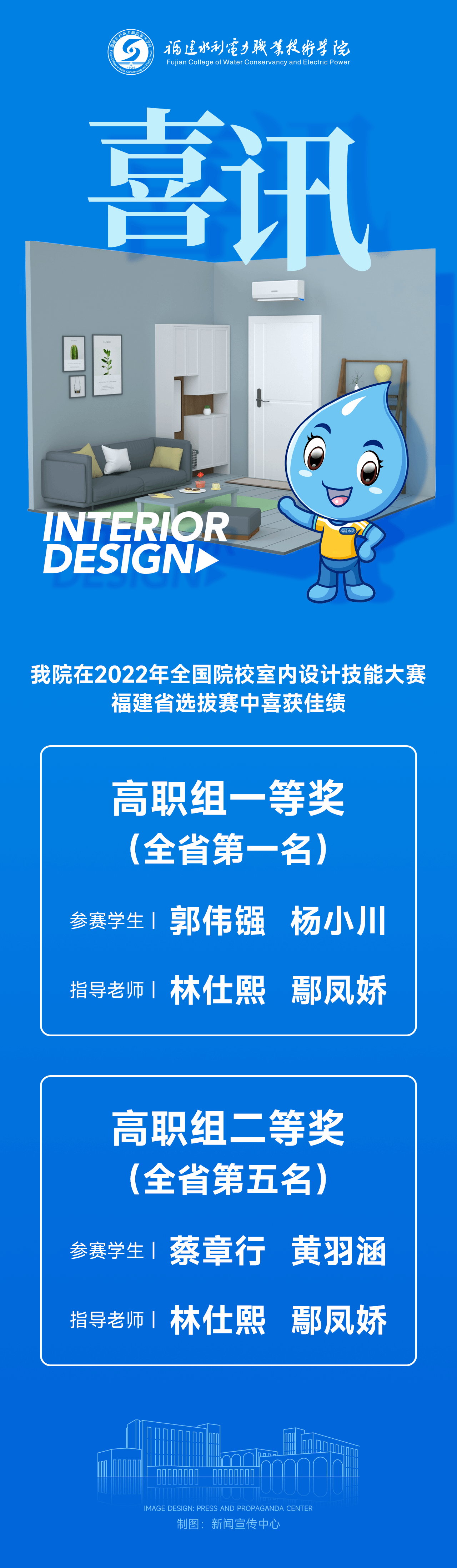近日,2022年全国院校室内设计技能大赛福建省选拔赛结果公示,我院林仕熙、鄢凤娇老师指导的郭伟镪、杨小川团队及蔡章行、黄羽涵团队分别以全省第一名、第五名的好成绩分别获高职组一等奖、二等奖。