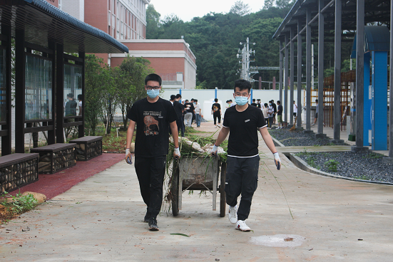 做工作要有始有终,除草后收尾工作也不可少。大家齐心协力把杂草运送出去,除草时、搬运中有很多泥土洒在路面上,合力把路面打扫干净。经过近两个小时劳动,偌大的实训基地,由之前的杂草丛生变得整洁如新了。