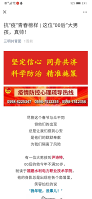 翁泊桑2019年从东部战区空军地导某旅退役,现就读于福建水院建筑工程系造价1936班。新冠疫情发生后,他积极响应学校和政府的号召,报名参加了将乐县双拥办发起的抗击疫情志愿服务。