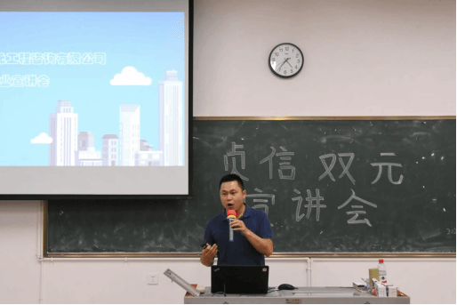 在企业宣讲会上,贞信双元公司总经理吴汉灯以10届学长的身份与同学们分享了自己毕业以来的从业经验;介绍了贞信双元公司目前在行业中所涉及的领域及突出的专业能力;表达自己想要通过校企合作这个平台与母校共同努力,达成造价专业学生于校内即可达成企业岗位能力要求的愿景。
