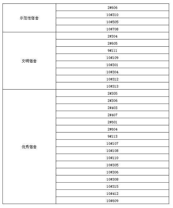 为了促使学生养成文明健康的生活习惯,奠定创建安全健康、清洁文明、和谐高雅美丽校园的坚实基础。按照《福建水利电力职业技术学院学生手册》、《建筑工程系星级创建及宿舍管理办法》的有关规定。经各班辅导员推荐,系部评选,决定对10#708等4个示范性宿舍、2#304等8个文明宿舍、2#305等16个优秀宿舍进行表彰。示范性宿舍,给予所在宿舍成员在学期综合素质积分评定舍员每人加8分、宿舍长加9分的加分奖励;文明宿舍,给予所在宿舍成员在学期综合素质积分评定舍员每人加6分、宿舍长加7分的加分奖励;优秀宿舍,给予所在宿舍成员在学期综合素质积分评定舍员每人加4分、宿舍长加5分的加分奖励。