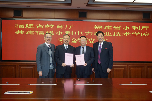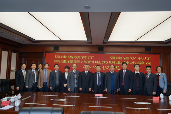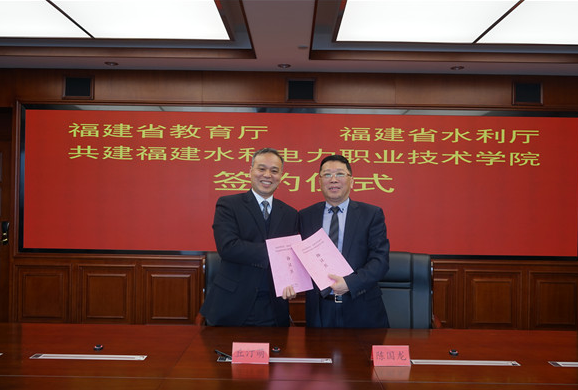29日上午,福建省教育厅与福建省水利厅共建福建水利电力职业技术学院签约仪式在福州隆重举行。省教育厅副厅长陈国龙、省水利厅副厅长丘汀萌分别代表教育厅和水利厅签署了共建协议。省水利厅副巡视员黄明聪,福建省水利学会理事长连伟良,福建水利水电勘测设计研究院党委书记郭武,学院党委书记庄伟廉、院长杨元挺出席签约仪式。