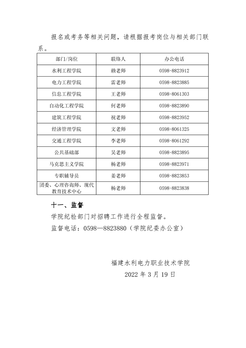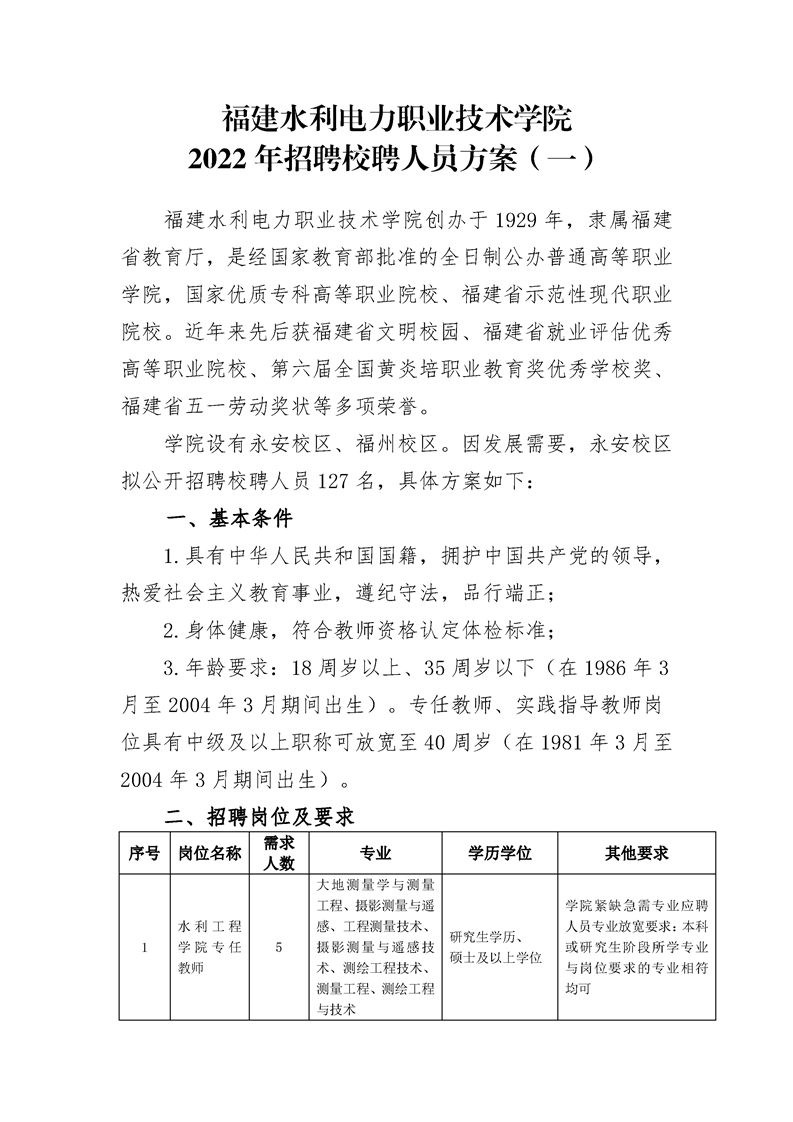 福建水利电力职业技术学院2022年招聘校聘人员方案(一)