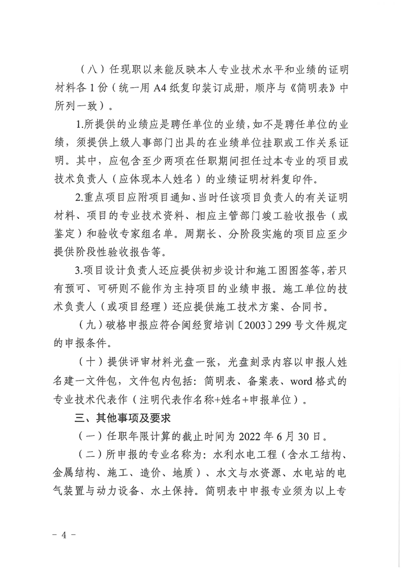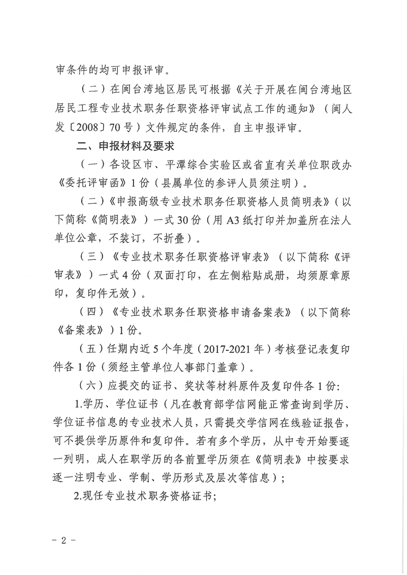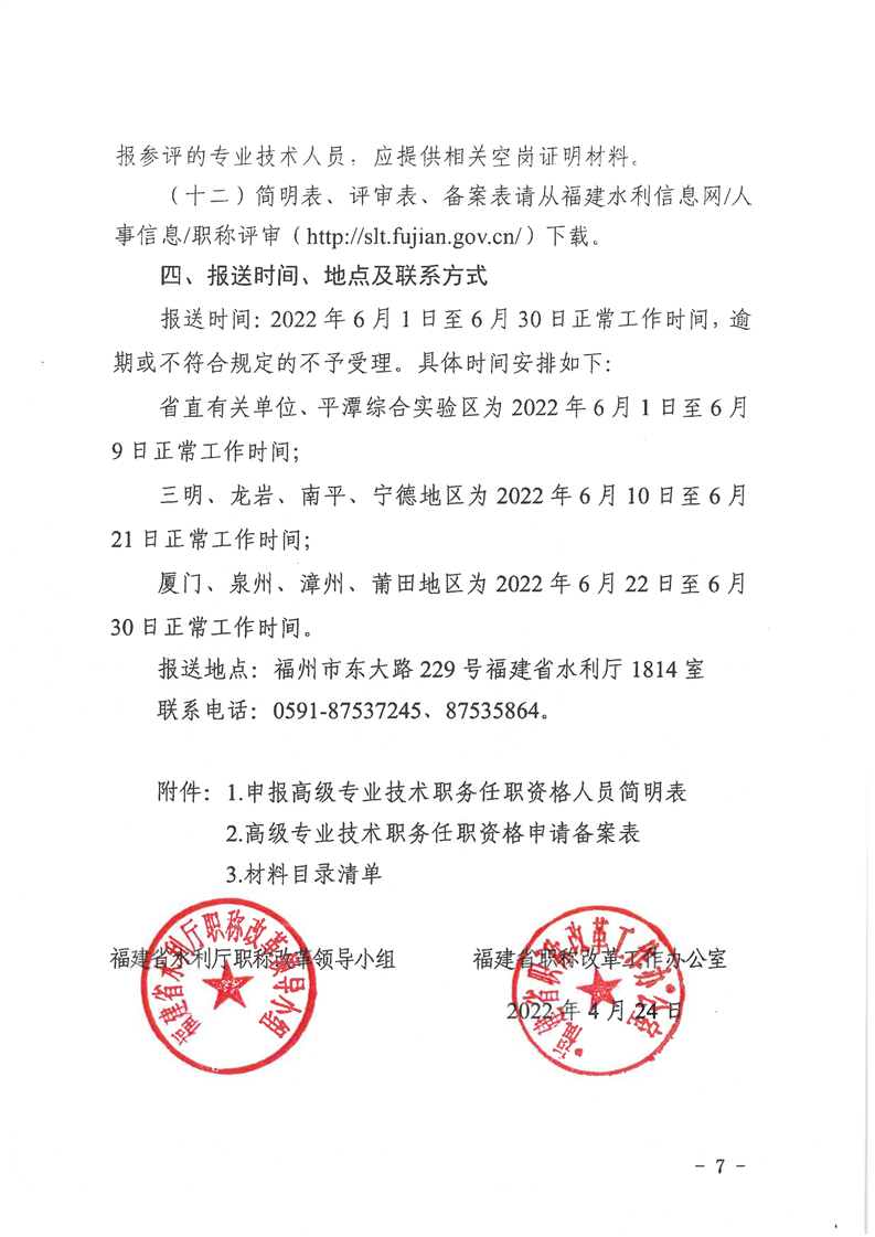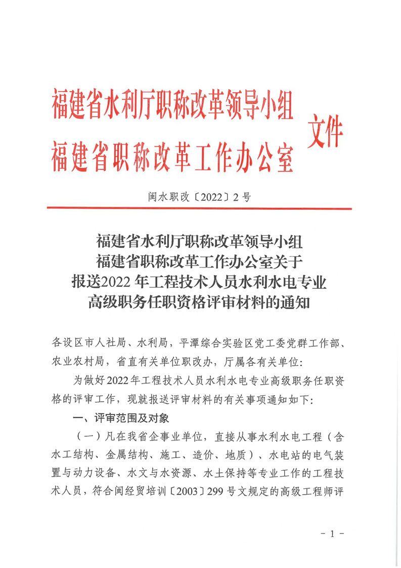 福建省水利厅职称改革领导小组 福建省职称改革工作办公室关于报送2022年工程技术人员水利水电专业高级职务任职资格评审材料的通知(闽水职改(2022)2号)