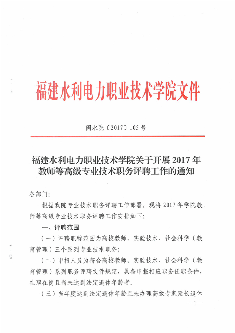 下一条: 关于开展2017年学院教师等高级专业技术职务代表作送审有关工作的通知(闽水院(2017)104号)