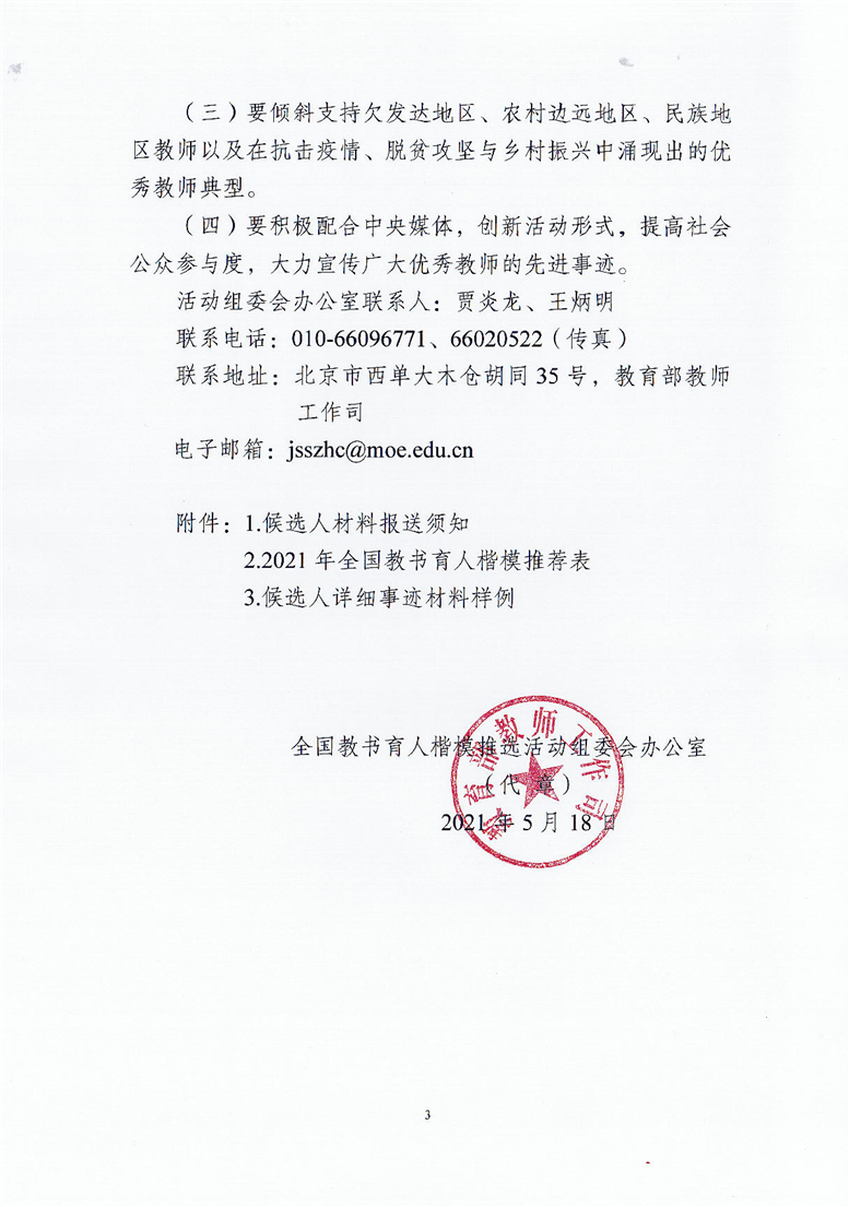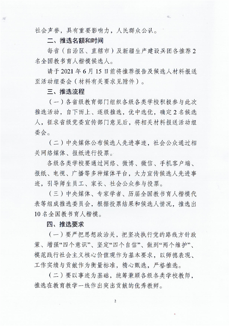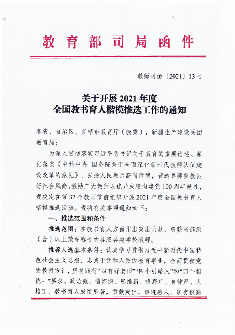 教师司函【2021】13号 教育部教师工作司关于开展2021年度全国教书育人楷模推选工作的通知