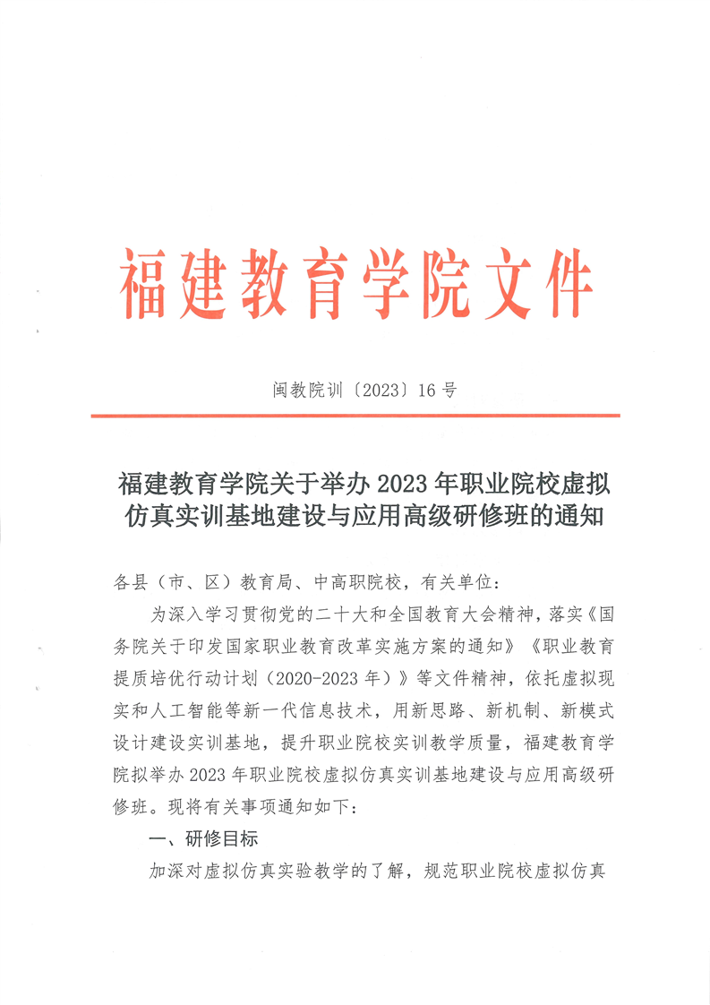 福建教育学院关于举办2023年职业院校虚拟仿真实训基地建设与应用高级研修班的通知