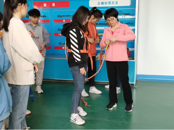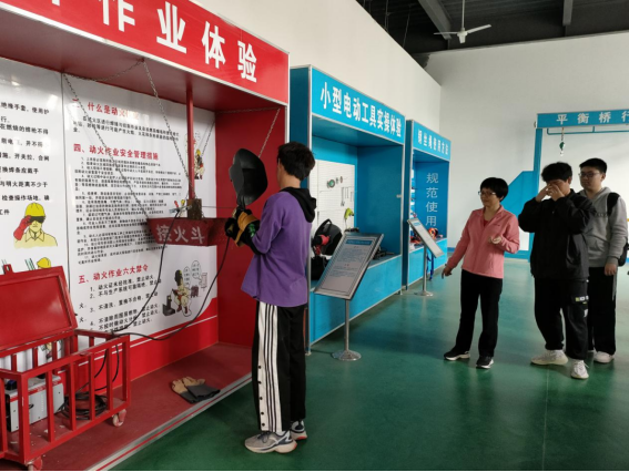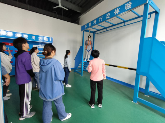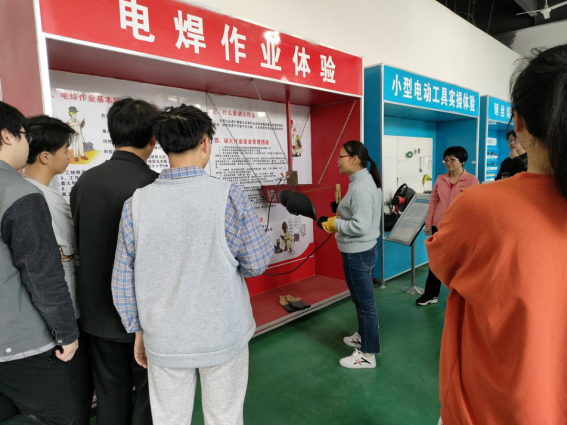 进入实训场所后,刘老师向同学们分别介绍了电焊作业原理、小型电动工具实操原理,她还指导同学们进行平衡桥行走体验和隧道逃生应急设备体验,对这些设备的使用和作用及使用时的注意事项等内容进行了详细的阐述。刘老师由内而外散发出一种亲近感,语言通熟易懂,很快就让同学们全身心投入到了此次参观学习当中。