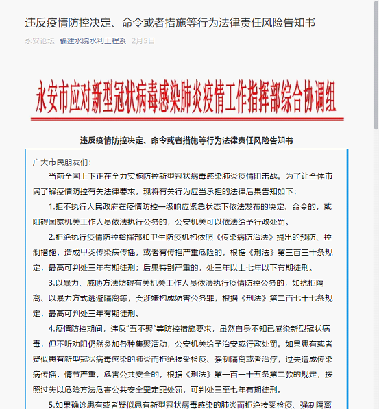 违反疫情防控决定、命令或者措施等行为法律责任风险告知书