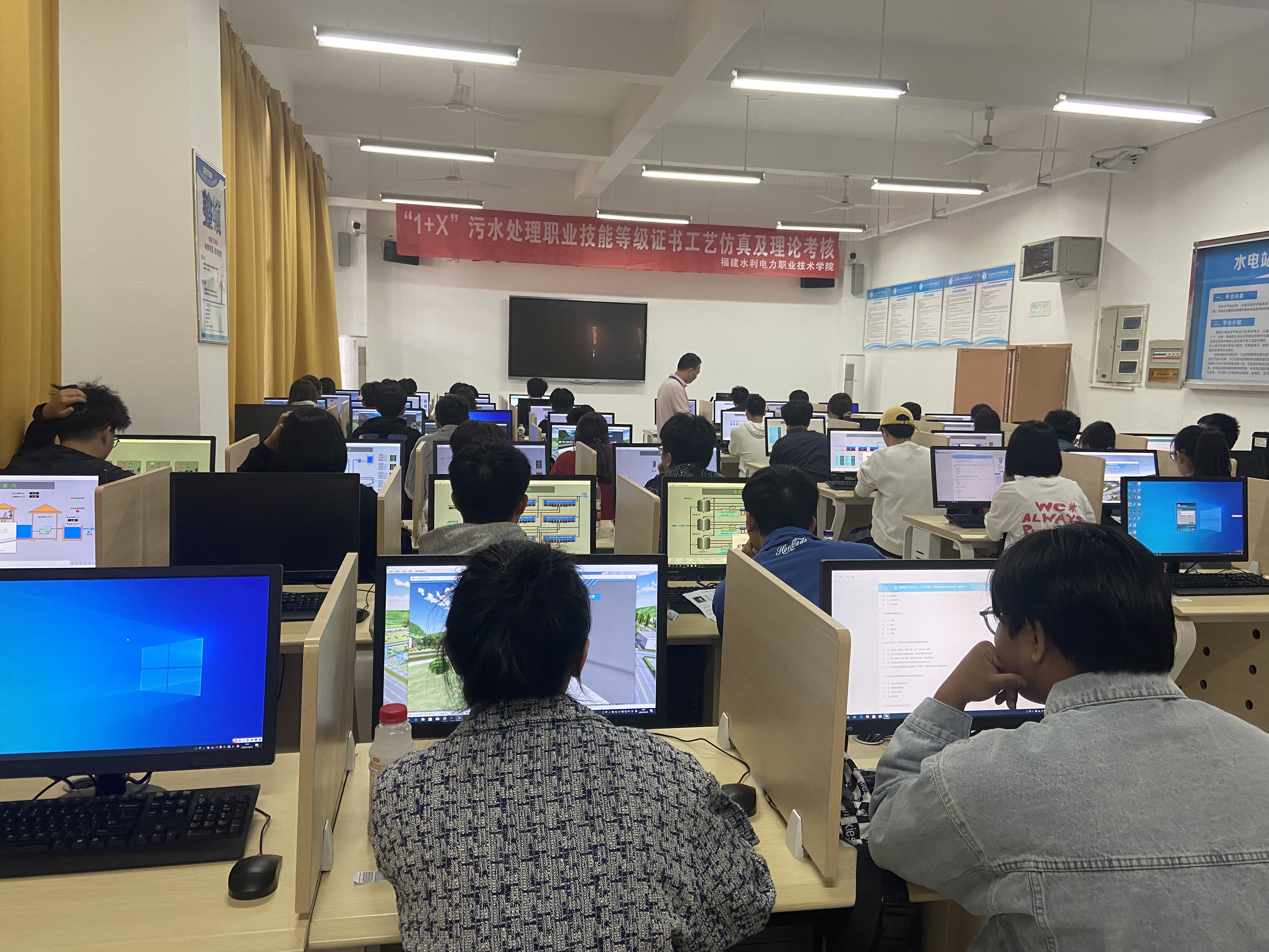 “1+X污水处理职业技能等级证书(中级)”考核内容包括理论知识、工艺仿真、安全实训、实验室操作四个模块。其中污水处理理论知识,污水处理工艺仿真操作考核形式采取全国线上统考,统一进行上机操作。本次考试从以上四个模块,全面考查了学生的理论知识、专业素养和技能操作水平。