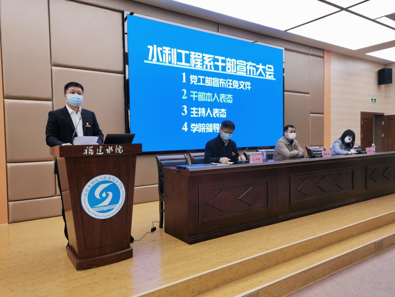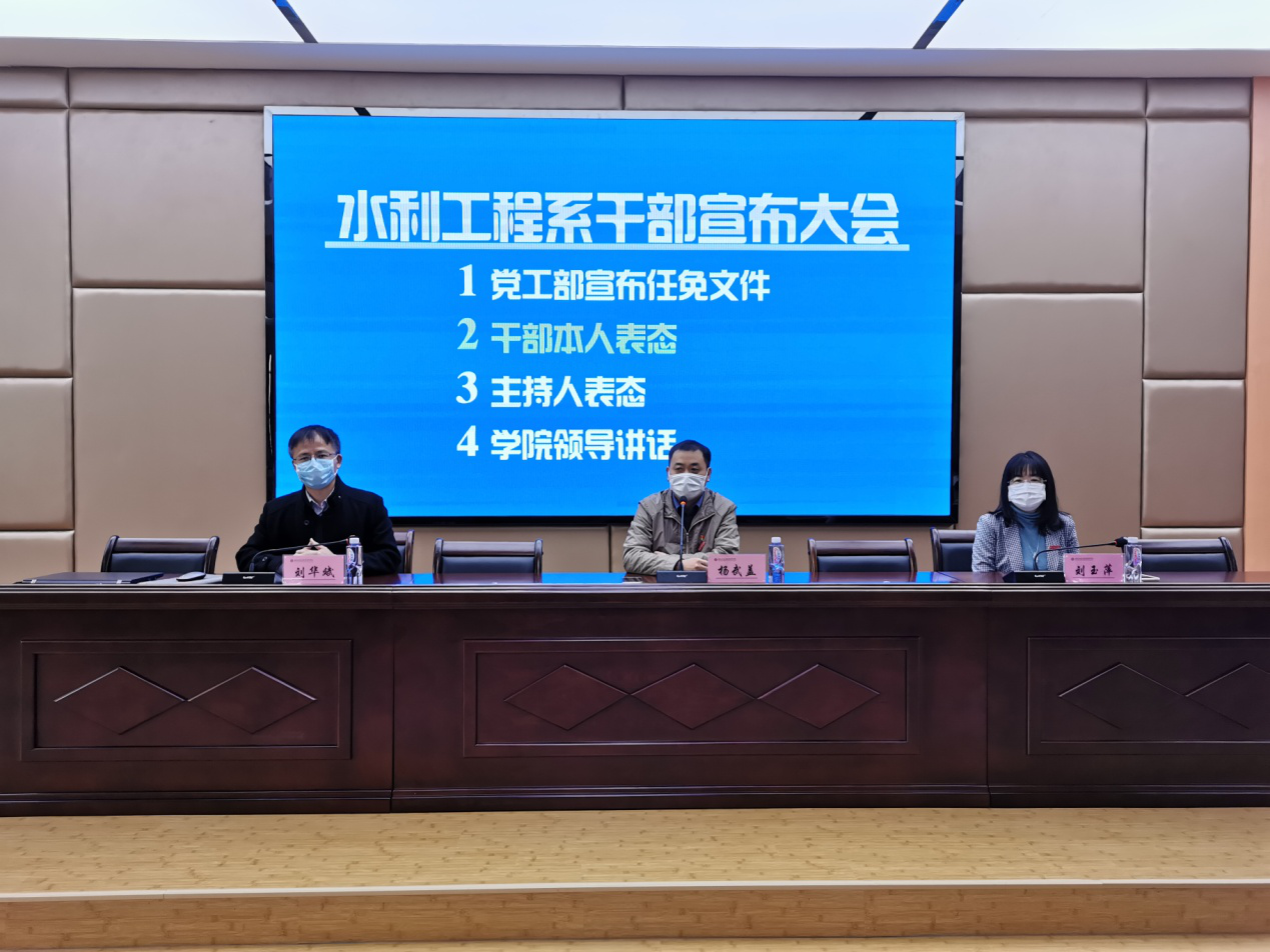 3月31日,水利工程系干部任职宣布大会在北教3-D01会议室举行,学院党委委员、副院长杨武盖,学院党工部部长刘玉萍,以及水利工程系全体教职工参加了本次大会,会议由系党总支书记刘华斌主持。