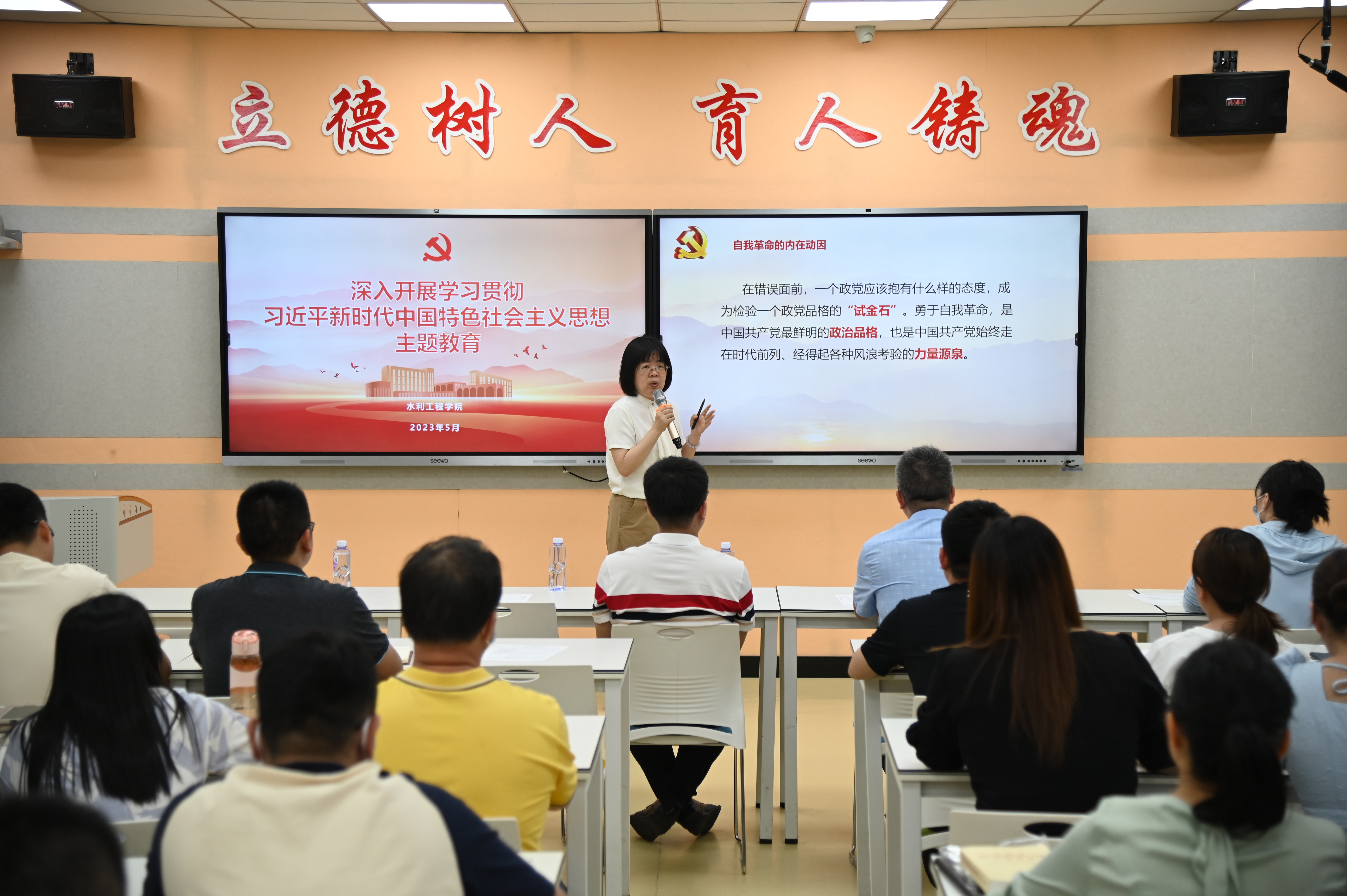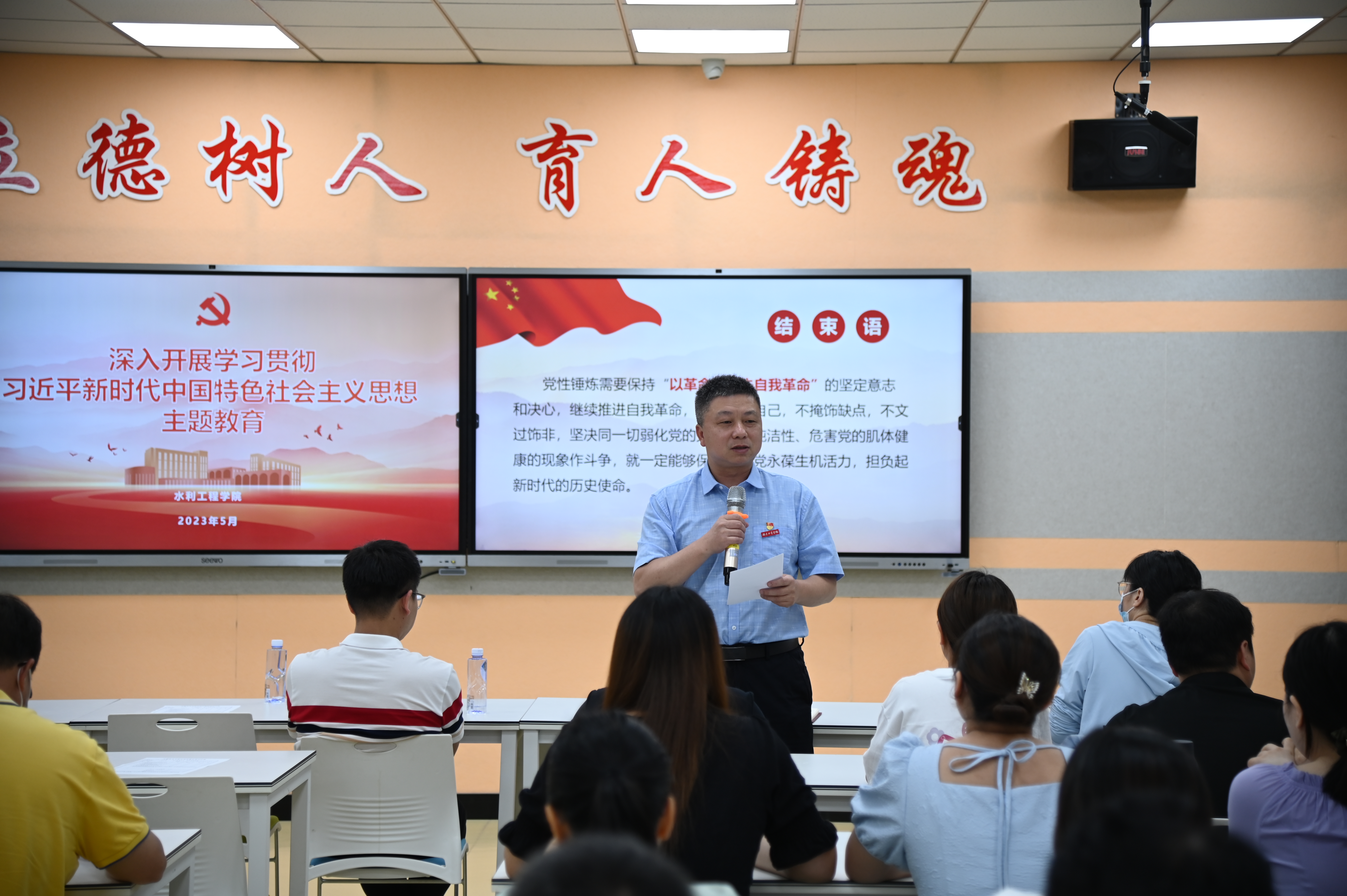 5月30日下午,水利工程学院在禹兴园6-405组织开展主题教育专题党课暨党总支理论学习中心组(扩大)学习会,学校主题教育协调推进一组成员方翔咏到会指导。