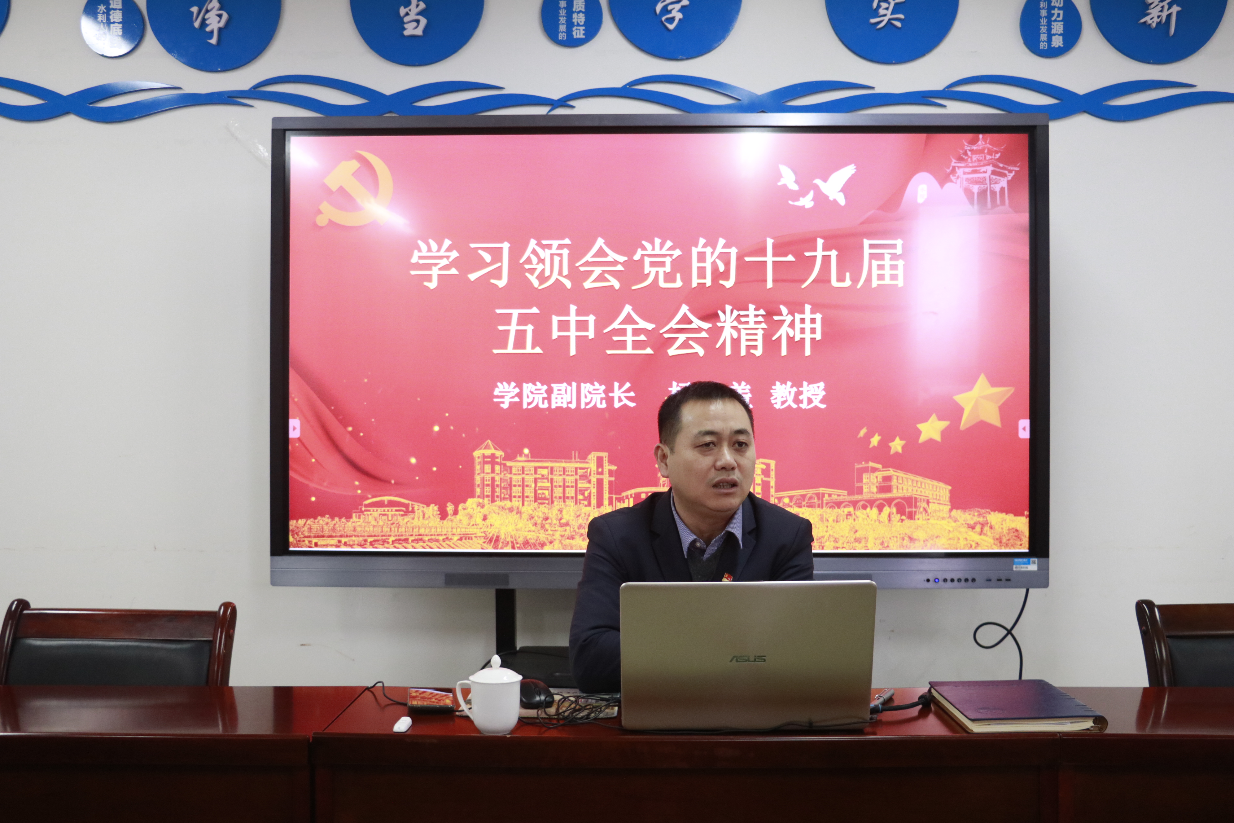 12月23日下午,学院党的十九届五中全会宣讲团成员、学院党委委员、副院长杨武盖在禹兴园7-501会议室向水利工程系全体教职工宣讲党的十九届五中全会精神。