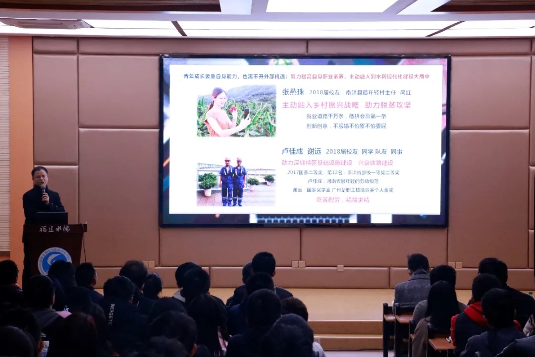 典型引领是对职业规划与专题辩论前两个教学活动的深化,引导学生以榜样为目标实现更好地成长成才。在课前,从优秀校友中精选5个在各自领域做出不平凡业绩的典型代表,为学生成长成才领路。分别是融入国家基础设施建设发展大潮的全国水利优秀企业家黄金星;助力深圳特区基础设施建设、兴泉铁路建设的河南省最年轻的劳动模范卢佳成;主动融入乡村振兴战略、助力脱贫攻坚的南靖县最年轻村主任张燕珠;忠于水文防汛应急管理事业的全国水利技术能手黄蓉秀;融入国家水利重大科研攻关项目建设的武汉大学博士生导师陈益峰。这些优秀校友自身思想政治素质过硬、技术技能突出、勇于担当作为,主动融入到中华民族伟大复兴实践中建功立业。通过对这些优秀校友的认识和了解,学生进一步加深对全会精神的领会,增强了成长为水利现代化事业建设者和接班人的自觉性。