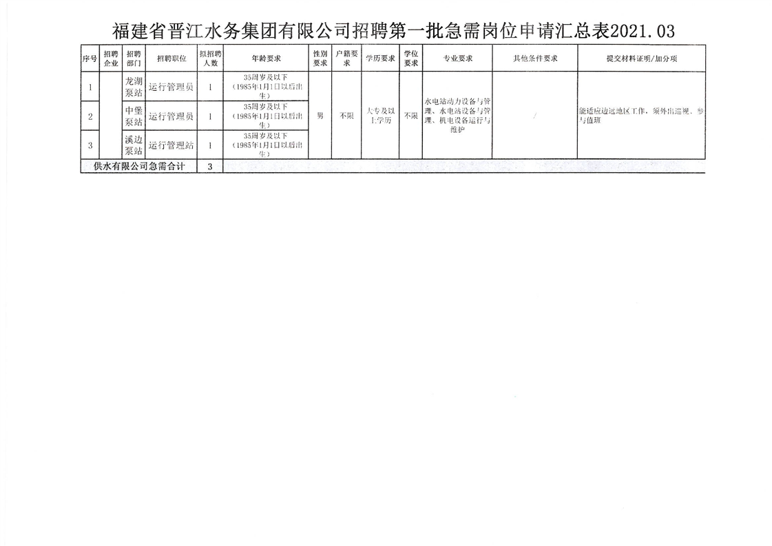 福建省晋江水务集团招聘需求表