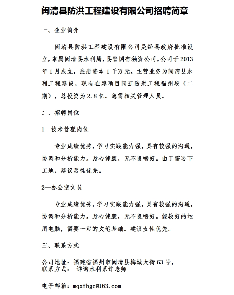 闽清县防洪工程建设有限公司招聘简章