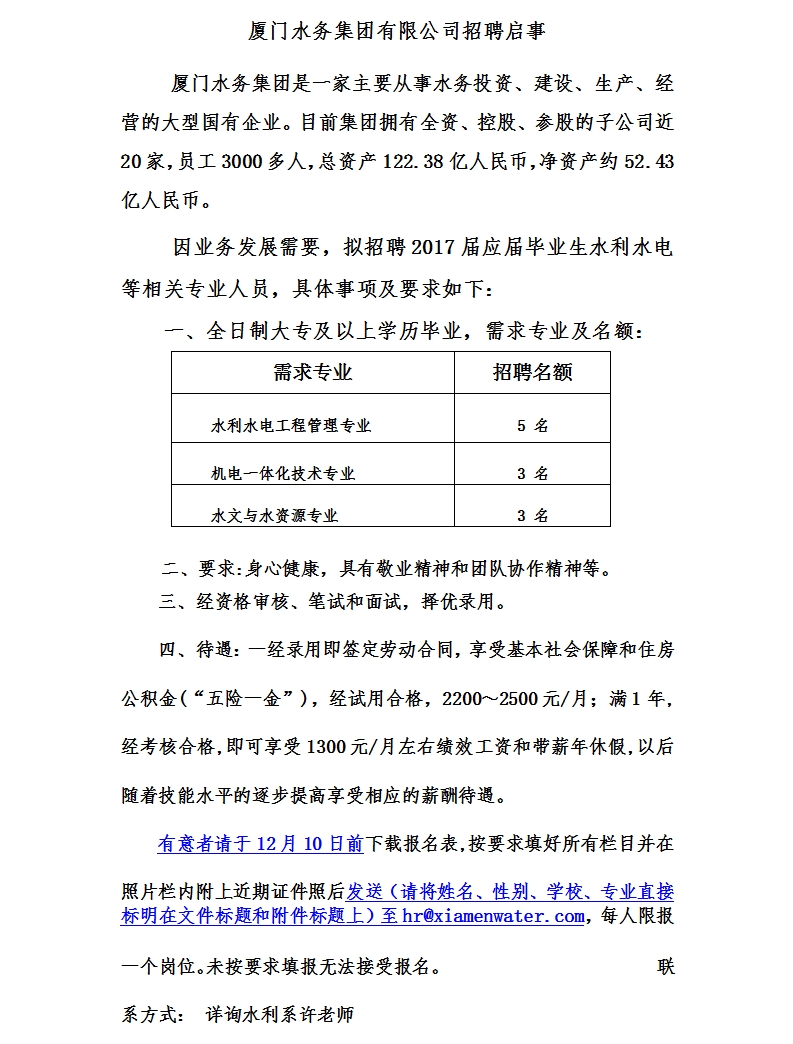 厦门水务集团有限公司招聘启事