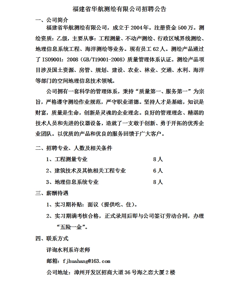 福建省华航测绘有限公司招聘简章