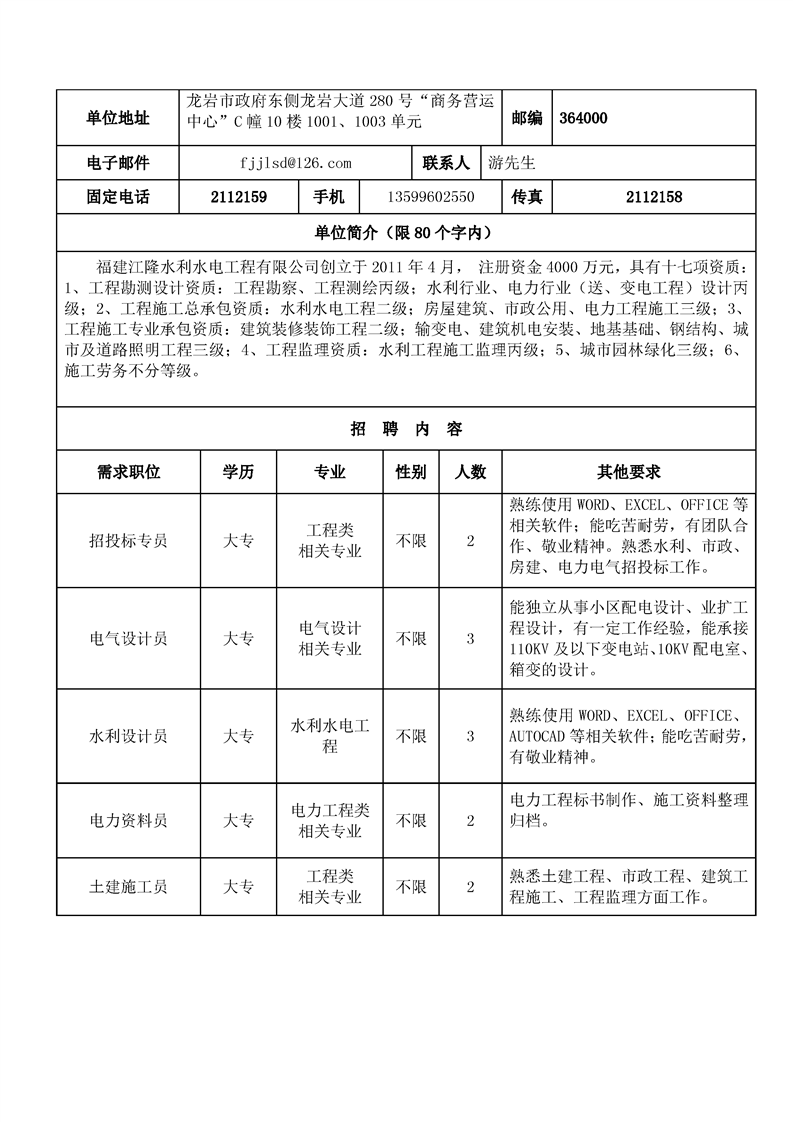 福建江隆水利水电工程有限公司招聘