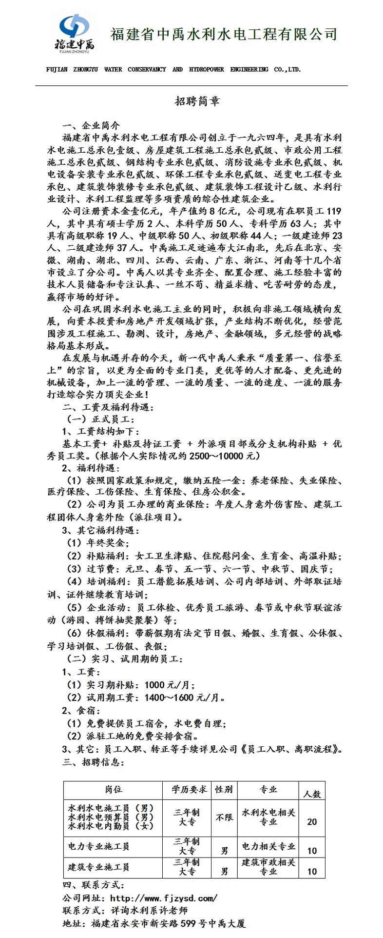 福建省中禹水利水电工程有限公司招聘简章