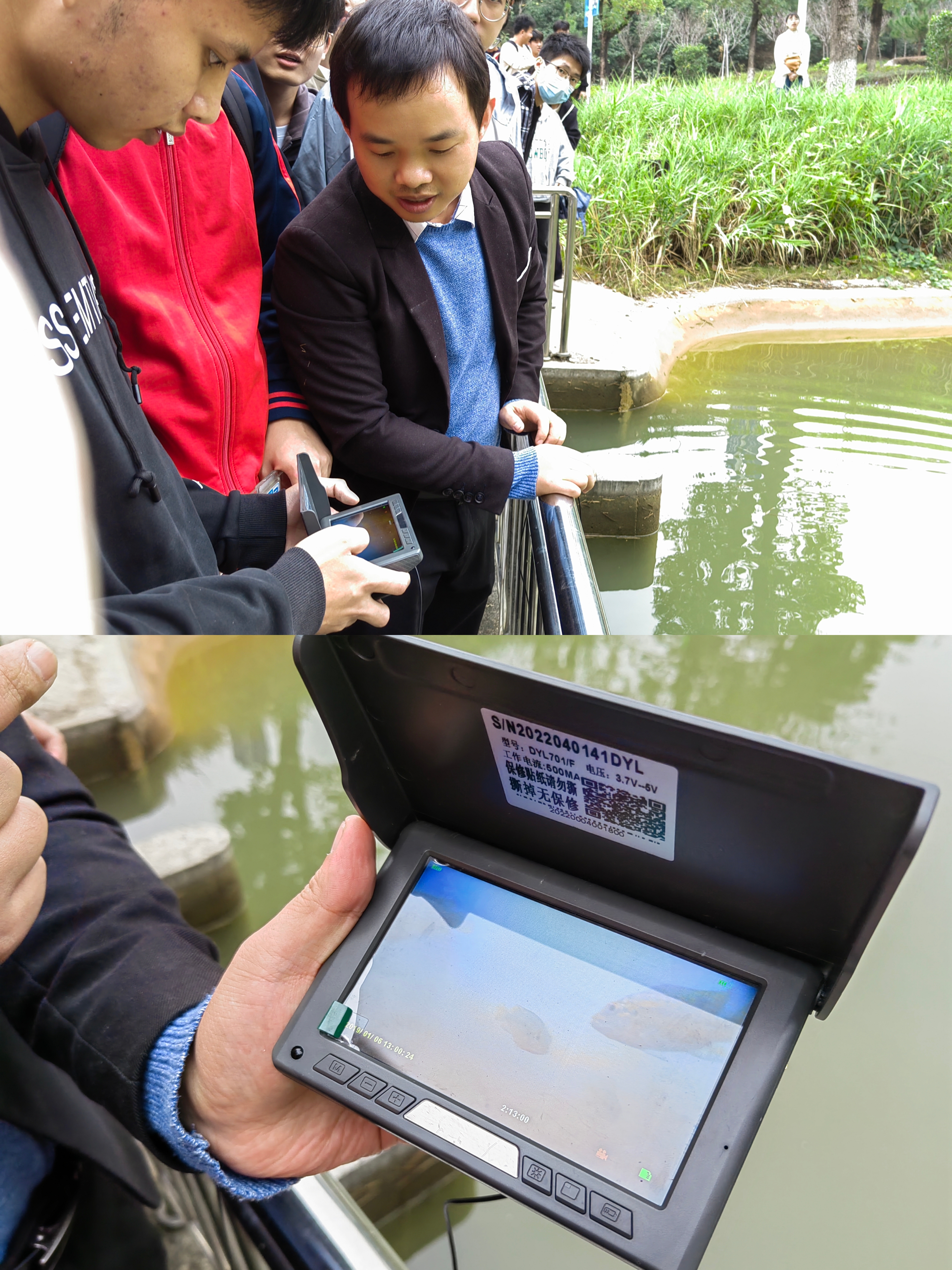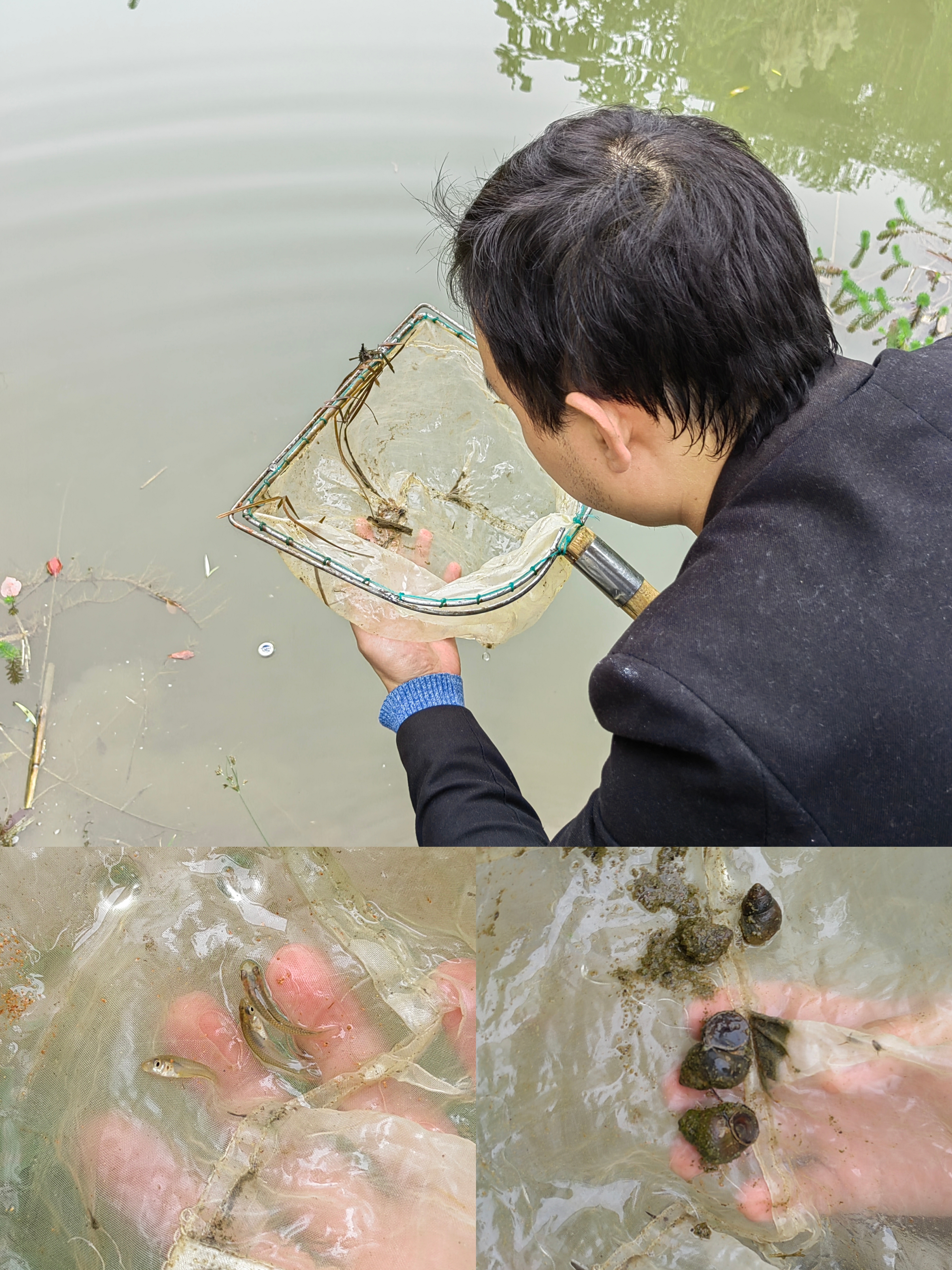 紧接着,为了让同学们能够直观感受水生动植物与水质保护的内在关系,学会通过水生动植物辨识辨识某一水域的水质情况,李老师带领同学们开展了一次“捕鱼”活动。李老师准备了相应捕鱼工具,并指导学生学会使用探鱼器,在师生共同努力下,很快就在实训旁的水池中捕获了大肚鱼等鱼类,李老师随即为同学们介绍了鱼类对提升水质的作用,还进一步介绍了田螺等其他水生动植物对水环境保护的重要性。此外,李老师还对水质的级别分类进行了相应科普,具体介绍了水质级别的含义、水质评价主要分类和方法。