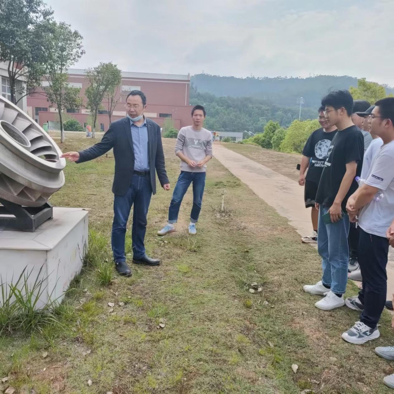 随后,跟着王老师步伐,大家来到发电站转轮实训场。在简单介绍转轮的用途后,王老师强调转轮性能的优劣对开发利用水能、提高水电站运行可靠性和经济性、保证电网可靠性方面有着巨大影响,是水电站更新改造的关键。