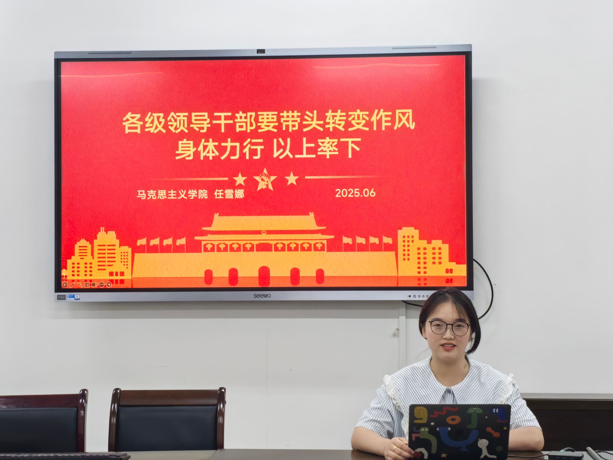 2025 年 6 月 24 日,马克思主义学院直属党支部在 7-535 会议室成功举办了中央八项规定政治理论学习活动。本次活动旨在深入贯彻中央八项规定精神,推动领导干部作风建设,进一步提升党员教师的政治素养和工作能力。由任雪娜同志领学,主题聚焦 “转变领导干部工作作风,以上率下 以身作则”。