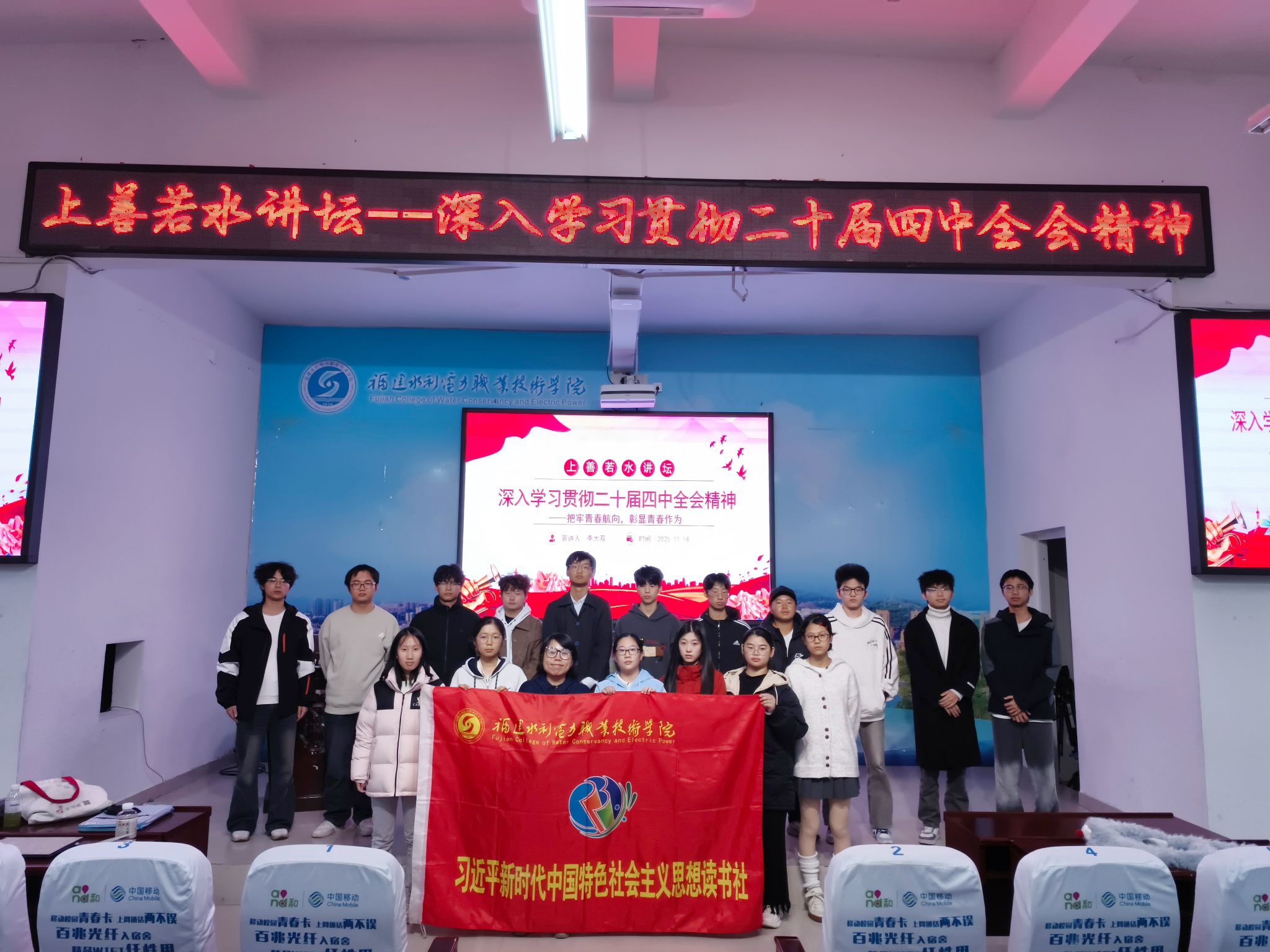 10月20日至23日,中国共产党第二十届中央委员会第四次全体会议在北京举行。为深入学习贯彻党的二十届四中全会精神,进一步引导广大青年团员坚定理想信念,汲取奋进力量。11月18日,马克思主义学院李大双老师开展以“深入学习贯彻党的二十届四中全会精神”为主题的“上善若水”讲坛,旨在帮助学生深化对党的政策理解,强化新时代青年的责任担当。机电2531班级、机电2532班级和习近平新时代中国特色社会主义思想读书社部分社员参加。
