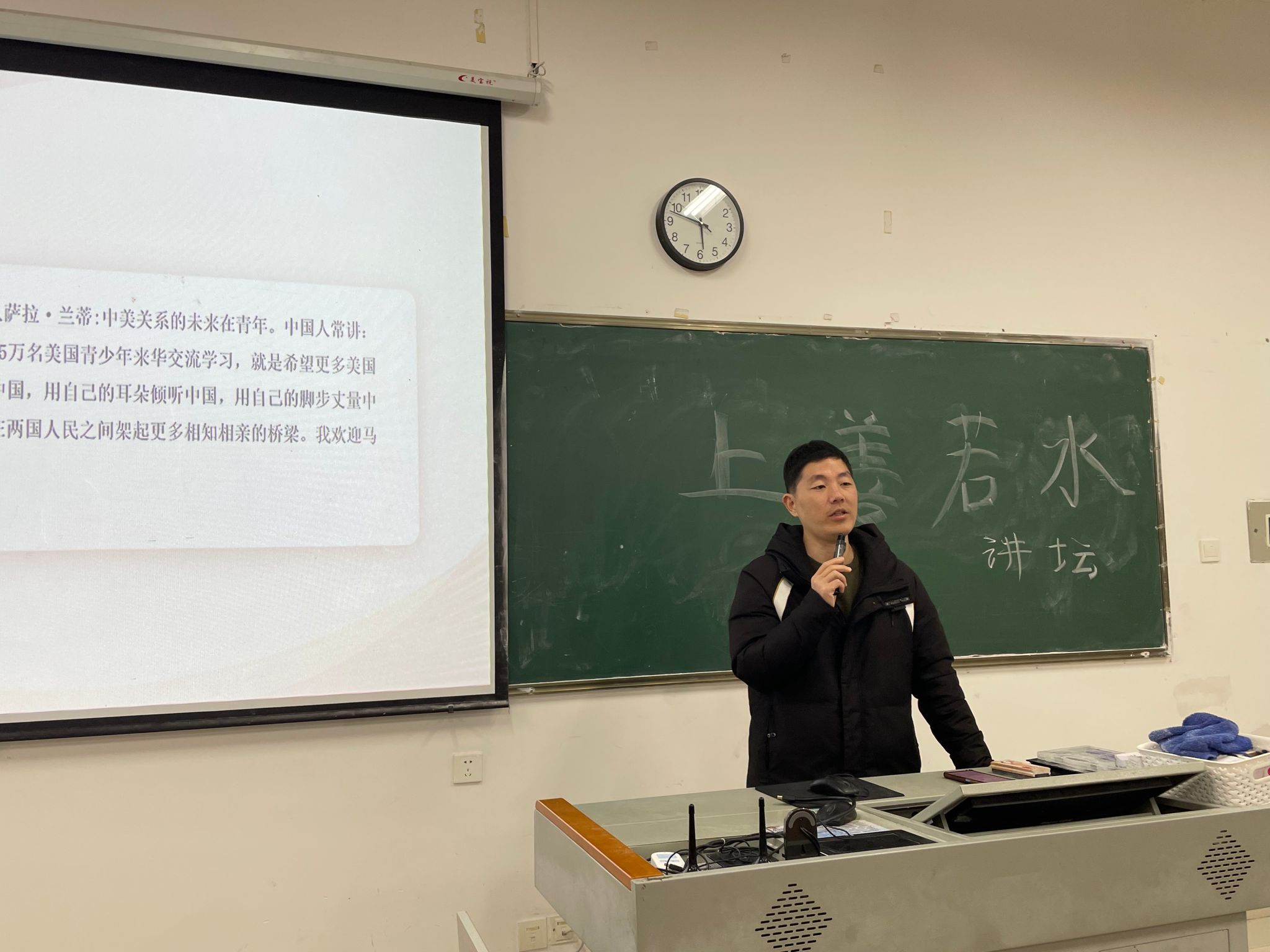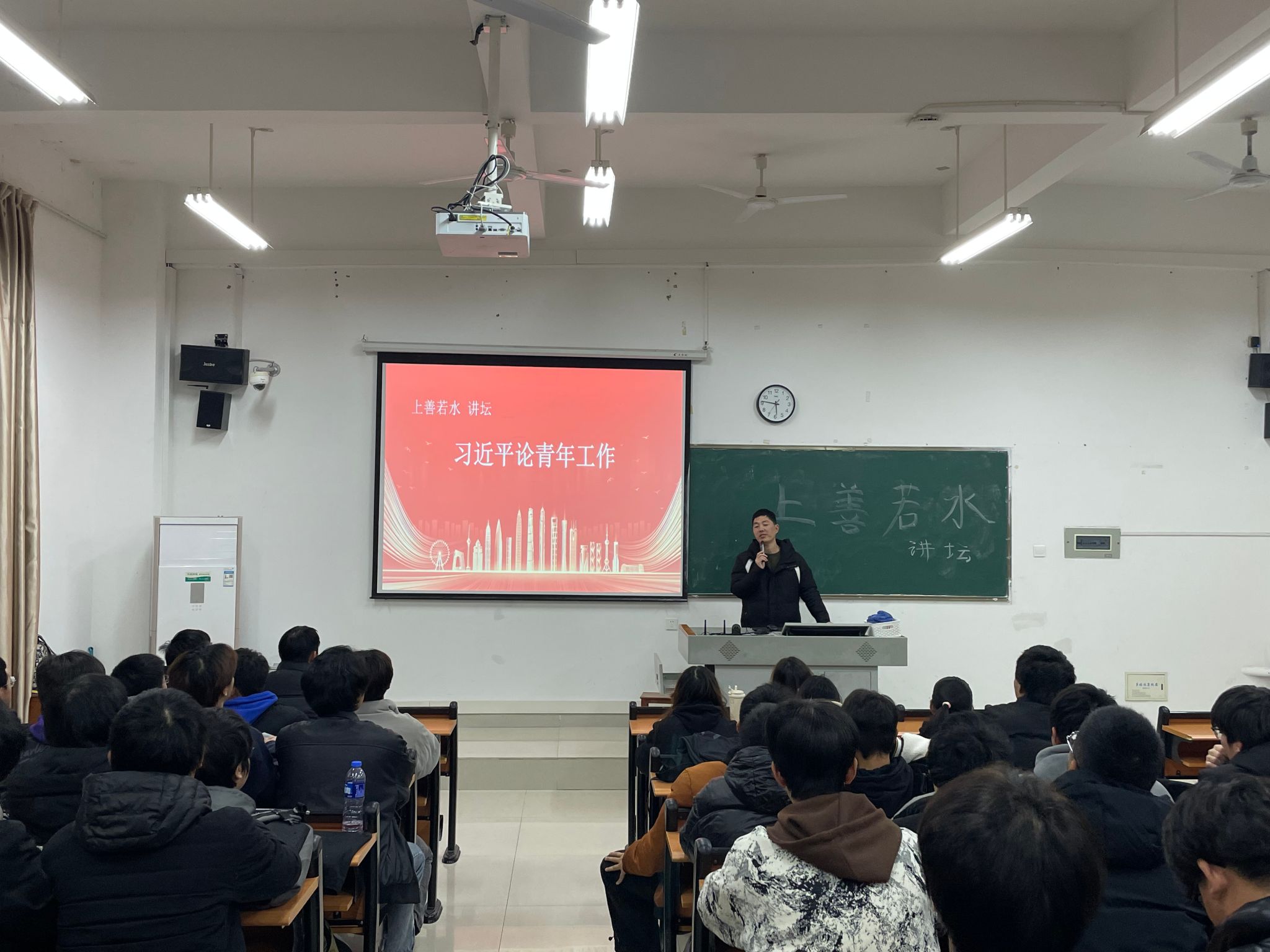 为进一步深入学习贯彻习近平总书记重要讲话精神,深刻领会习近平总书记对新时代中国青年提出的殷切期望,引导青年大学生进一步强化使命担当、坚定理想信念。2024年12月22日,马克思主义学院林耀华老师以《学习习近平论青年工作》为题,在禹兴园4-201举办上善若水讲坛,为在校120余名学生作专题讲座。